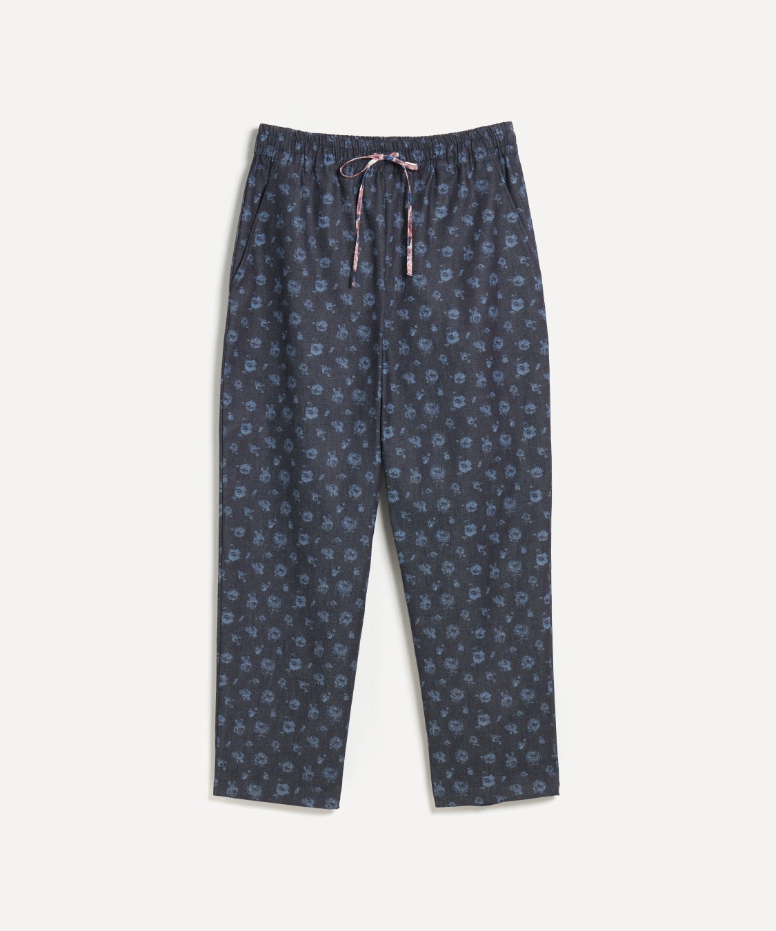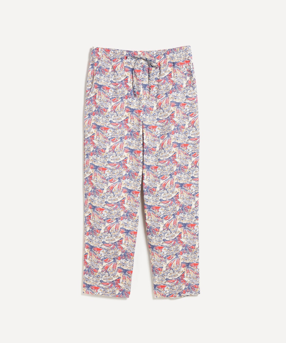 袖を折り返し、長さを変化させても楽しめるワイドスリーブのシャツジャケットです。ゆったりしたシルエットなので、スタイリッシュなキレイめスタイルはもちろん、スカートと組み合わせたフェミニンな装いにもコーディネイトしやすいデザインです。タナローンを採用した裏地が特徴です。同柄のパンツには、裏地と同じ柄のストリングがついているので、セットアップでのコーディネイトもお勧めです。