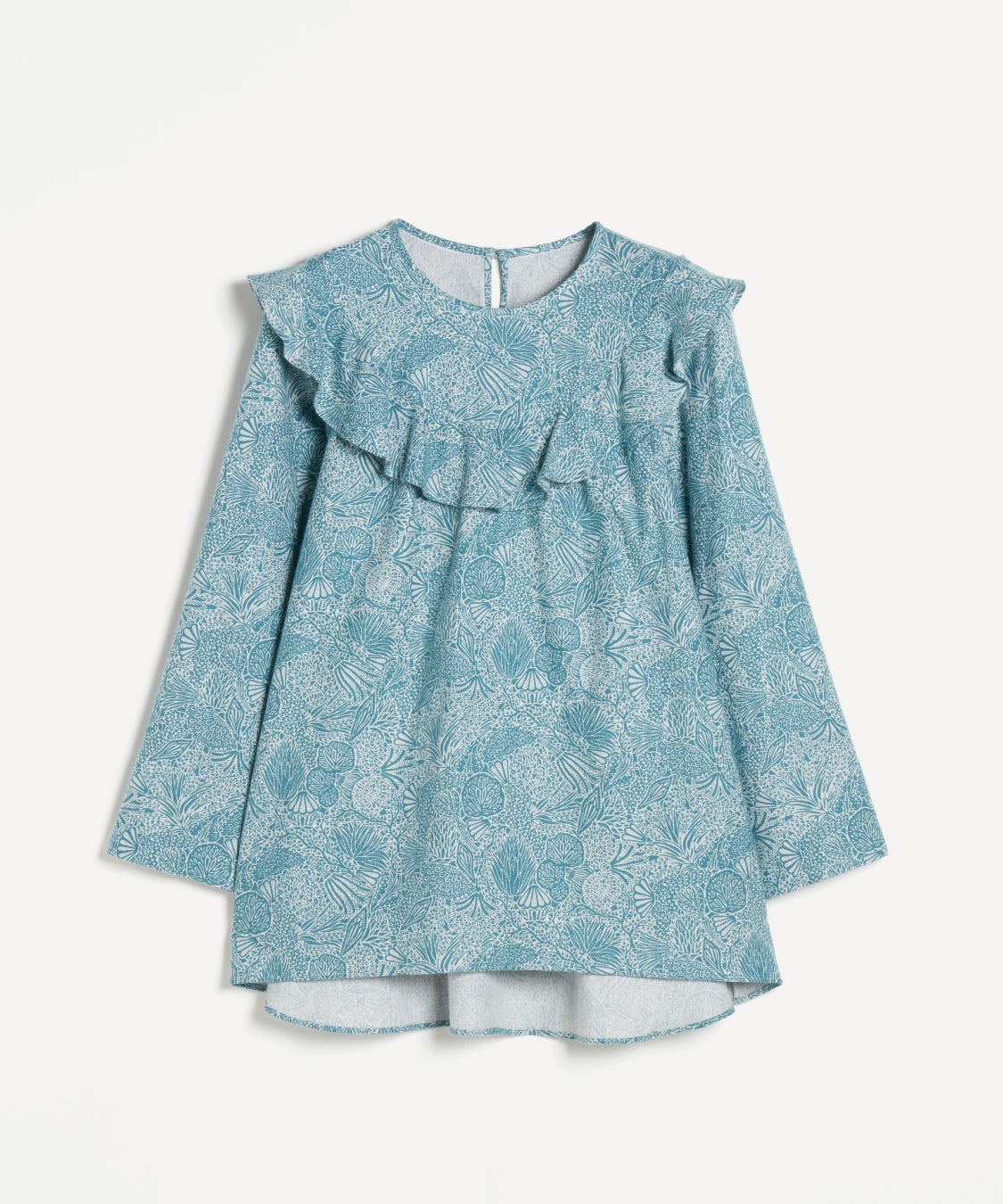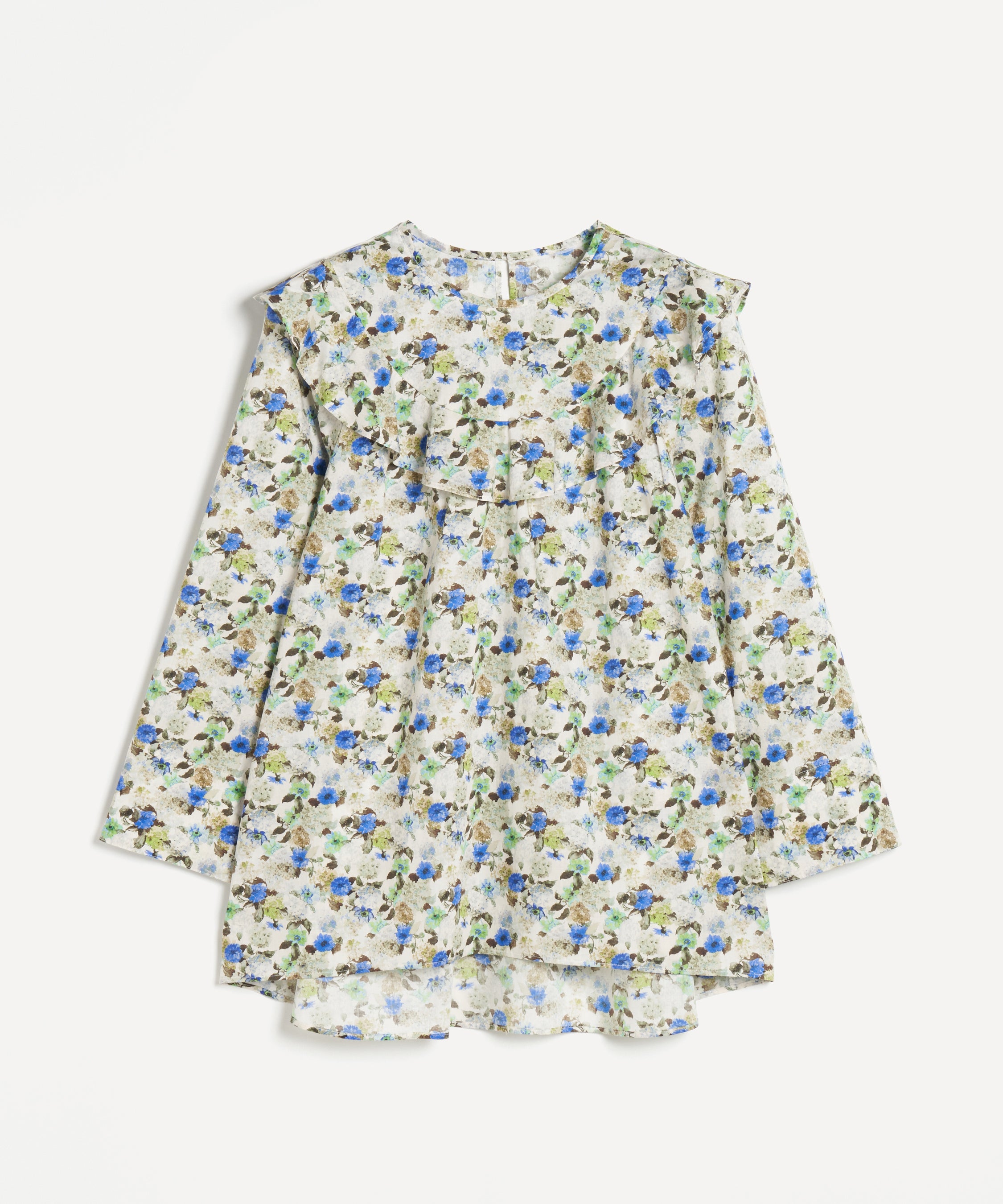 フリルがついた印象的なチュニックブラウスです。トレンドの長めの着丈と、たっぷりの分量感が一枚で着映えするデザインです。ヘムラインが前から後ろにかけて裾が長くなっているので、横からの見た目もおしゃれな印象に。カフを折り返しての着こなしもお勧めです。
