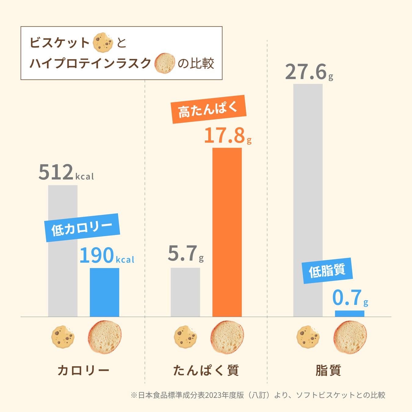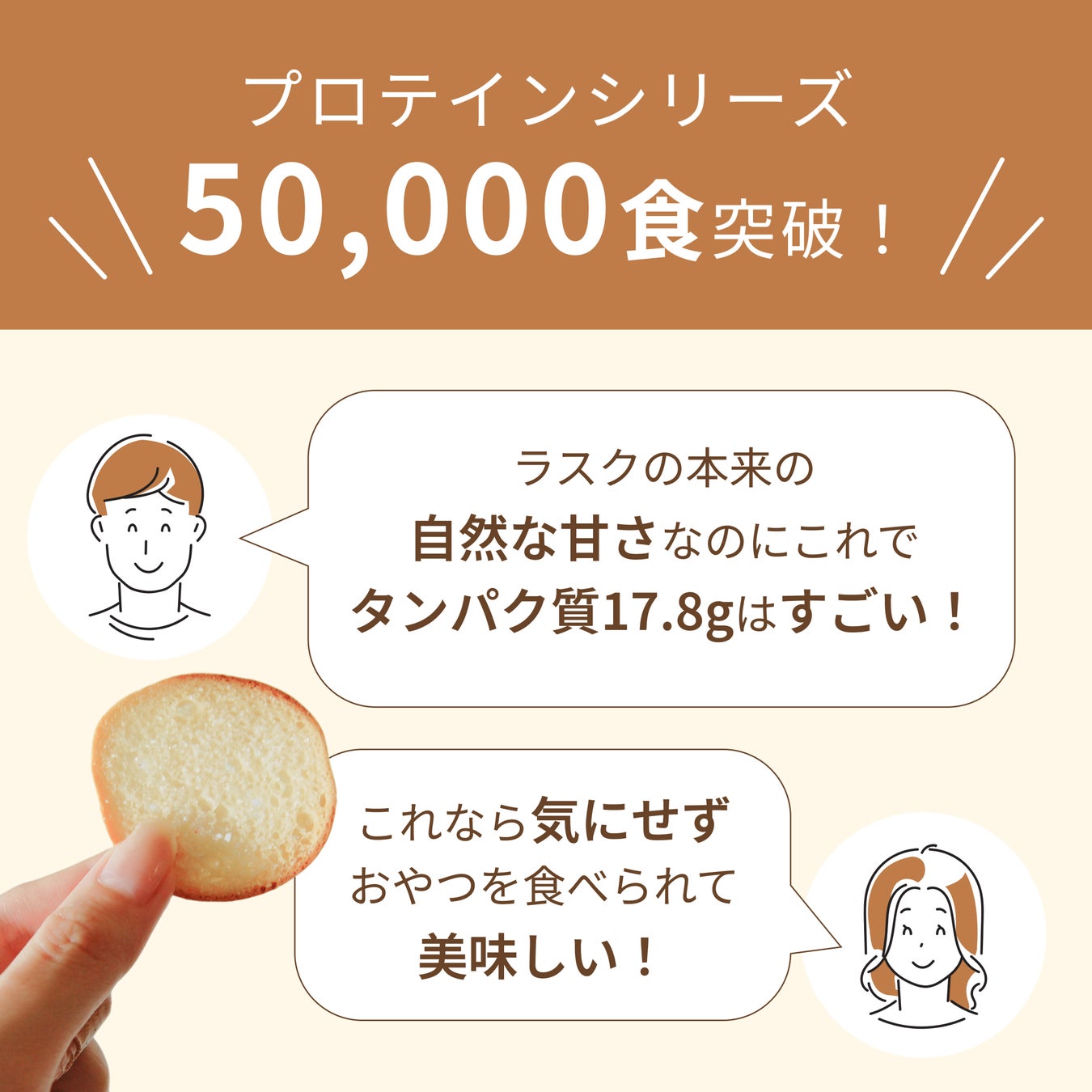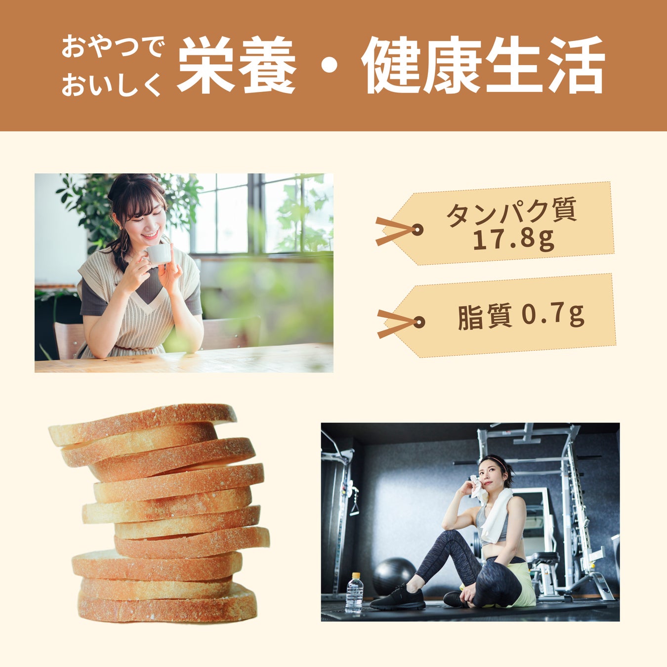 ◎ たんぱく質17.8g、脂質0.7gという、本来のラスクと変わらないおいしさとサクサク食感のままで、高タンパク・低脂質おやつを実現。健康的な生活を送りたい人はもちろん、ダイエットや筋トレ中の人にも。プロテイン代わりにおやつとして楽しめます。