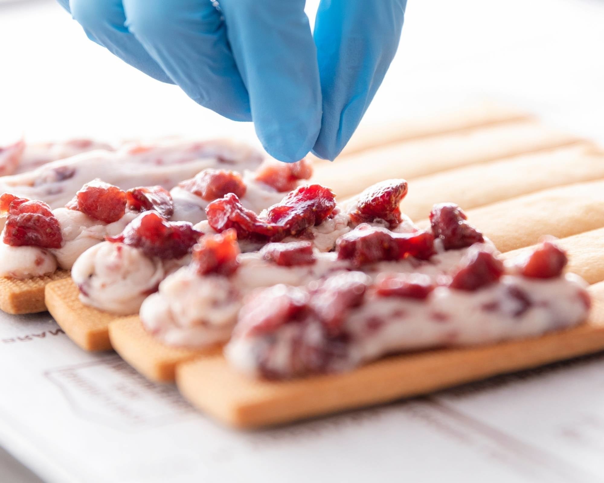 いちごは自家製のセミドライ苺を使用。きれいな酸味を出すために伊豆の高田農園さんから小粒で味の詰まった苺を選定して仕上げる。また、商品にしたときに苺の食感が残るようにコンポートにする際は、ジャムにならないように弱火で半日かけてじっくり煮ます。そちらを乾燥させて仕上げたセミドライ苺はしっかりと素材の旨み・酸味を表現します。