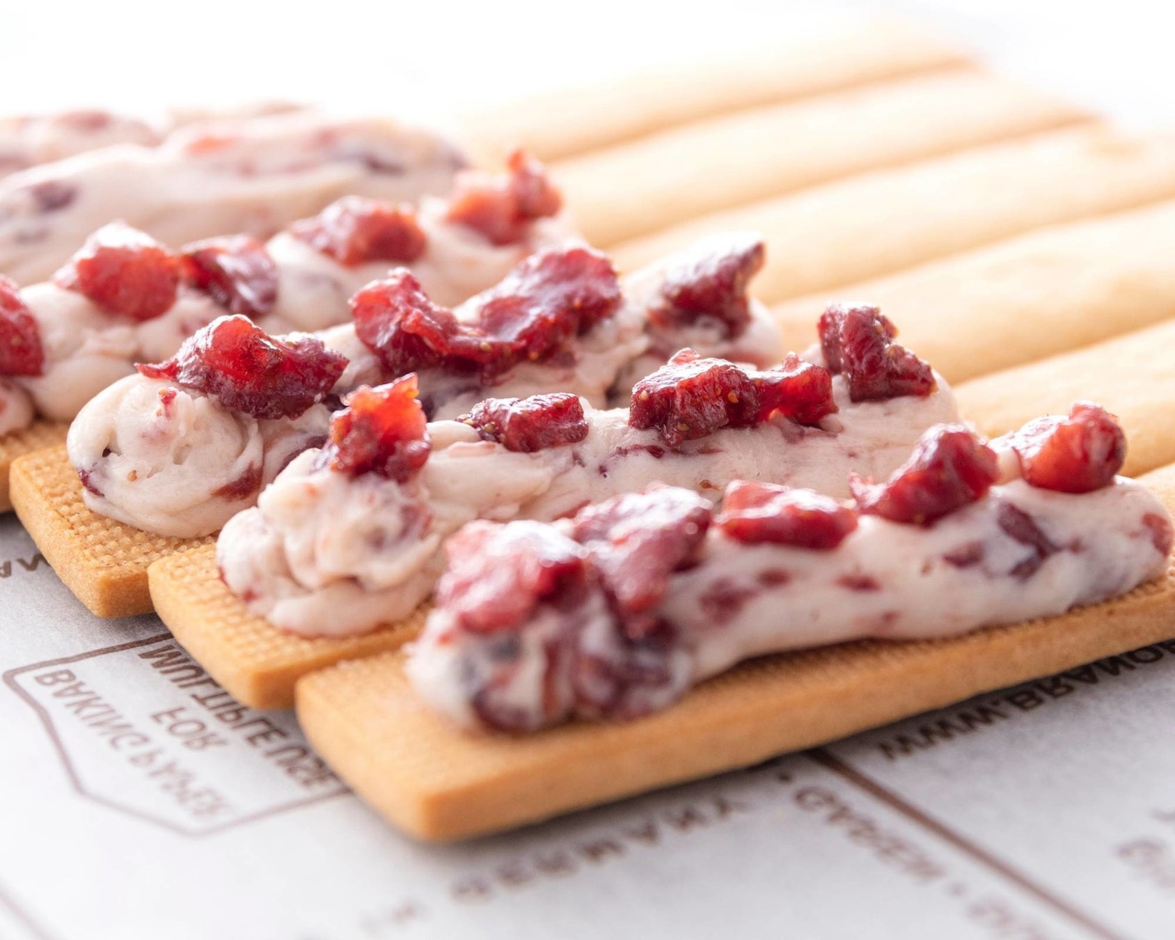 原材料:セミドライ苺、グラニュー糖、無塩バター、練乳、粉糖、アーモンドパウダー、卵、薄力粉、ベーキングパウダー、水、洋酒、レモン果汁