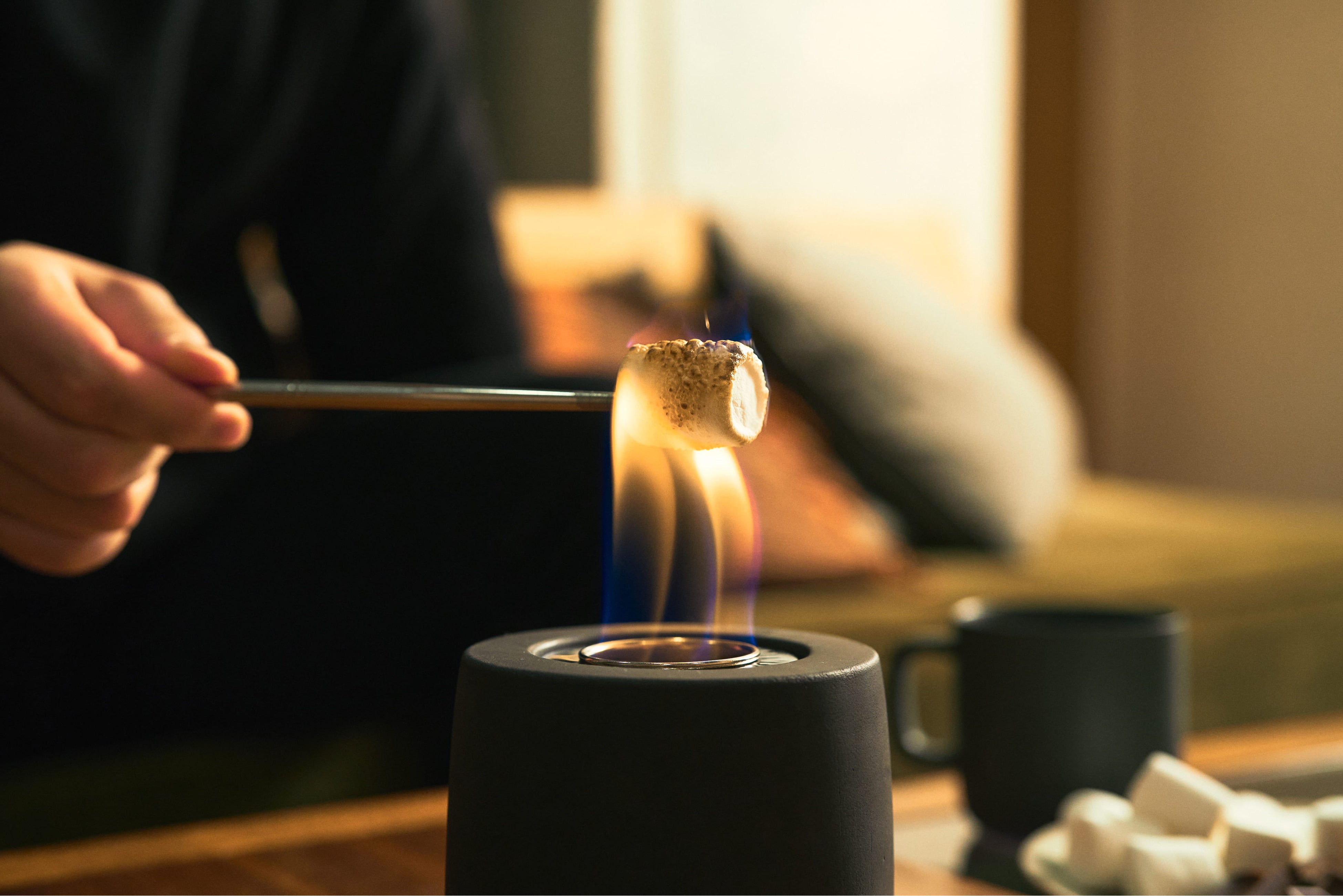 燃料にバイオエタノールを使用しているため、一酸化炭素などの有害物質が非常に出づらい設計となっています。化学式上、バイオエタノールの燃焼後に出るものは二酸化炭素と水だけです。燃焼による有害物質の発生がほぼないため、マシュマロを焼くなど簡単な調理も可能です。
