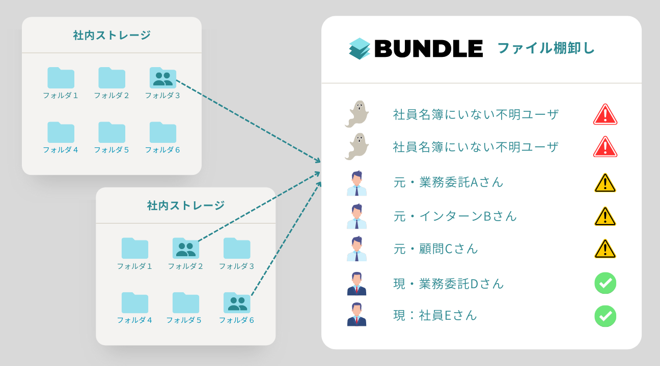 クラウドストレージサービス上のファイルの共有権限を持ったアカウントと、自社の従業員データベースのアカウントを紐付けします。雇用関係がなくなった人のアカウントや、誰かわからないアカウントへ共有されているファイルを外部共有ファイルと定義し可視化する事ができます。複数のストレージサービスを横断して管理する事が可能です。