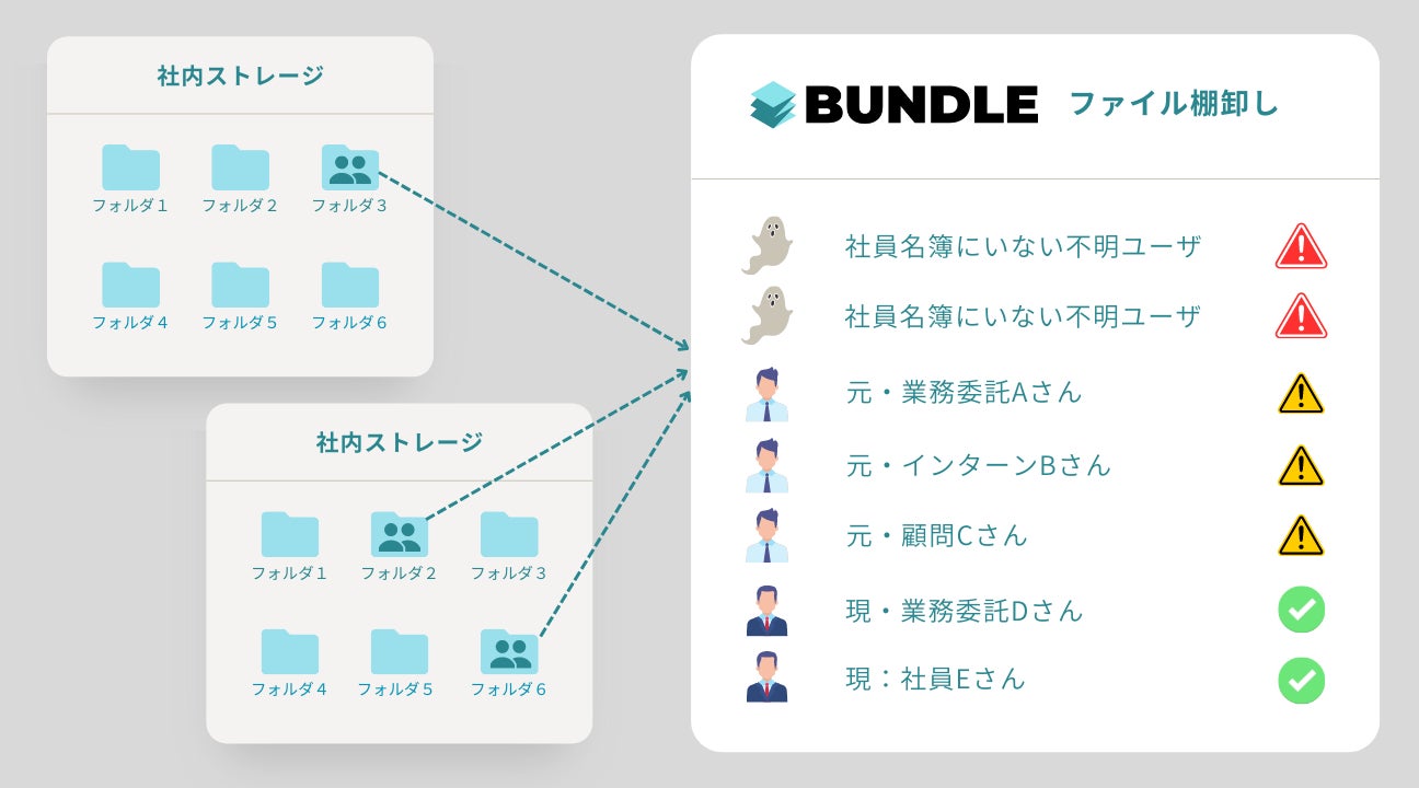 企業の業務効率化において多数のSaaS製品の活用が進む中、SaaS製品のアカウント管理が複雑化してきております。それに伴い、外部企業に対して クラウドストレージ上のファイルの閲覧権限を共有設定にしたまま放置してしまう事が課題となっております。このような課題を解決するべく、当社プロダクトの「SaaS一元管理ツールBundle」では、SaaSのアカウント管理だけではなく、クラウドストレージ上のファイルに関する共有設定の棚卸し機能を追加しました。
