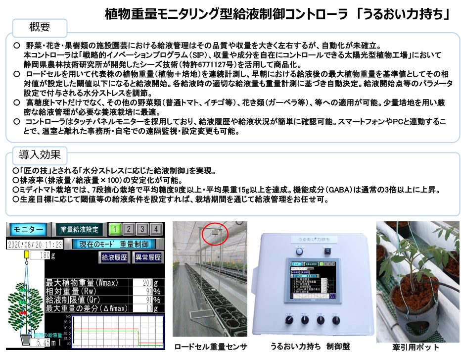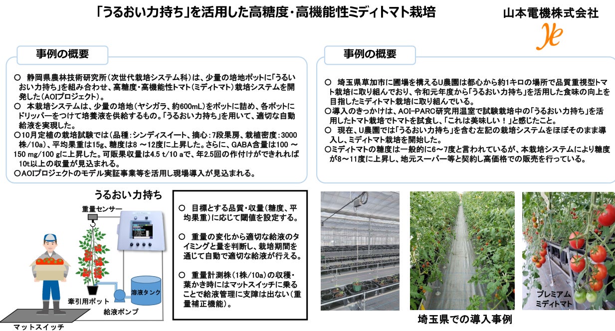 山本電機株式会社が開発・販売開始をした「うるおい力持ち」はトマト栽培において重要な潅水をトマトの株の重量に応じて自動潅水するシステムです。