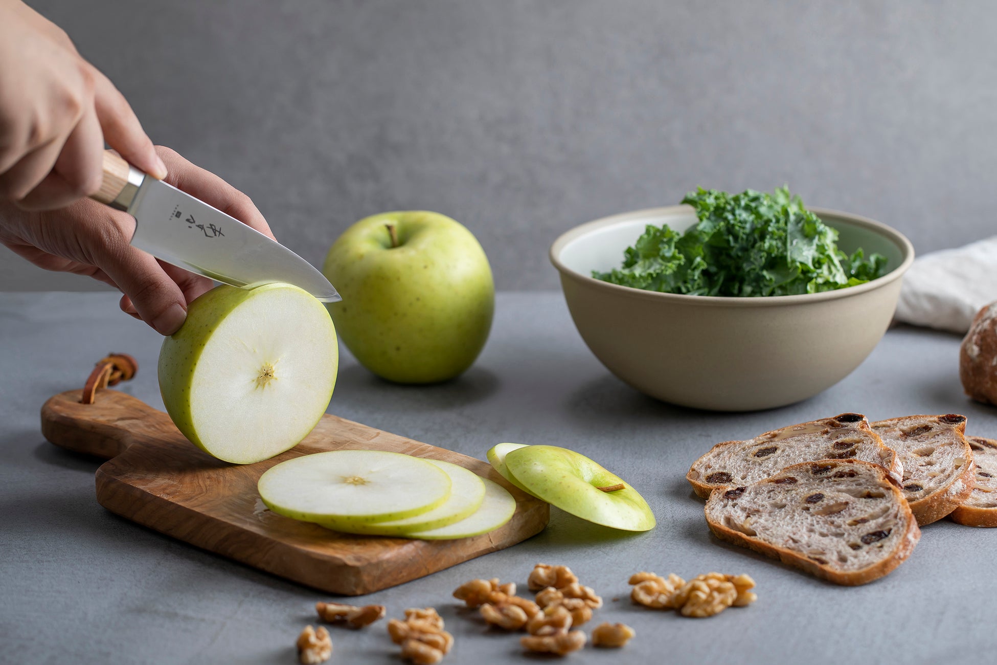 鎚目が特徴の37層鋼は、和の要素を感じさせながらも、伝統によりすぎない軽やかさと清潔感があるデザインで個性が際立ちます。(写真:あすか 37層鋼 ペティナイフ 14,300円(税込))