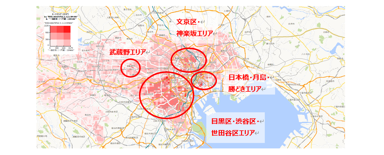文京区や目黒区・世田谷区等、富裕度が高く、かつ戸建ての多いエリアにも広がる