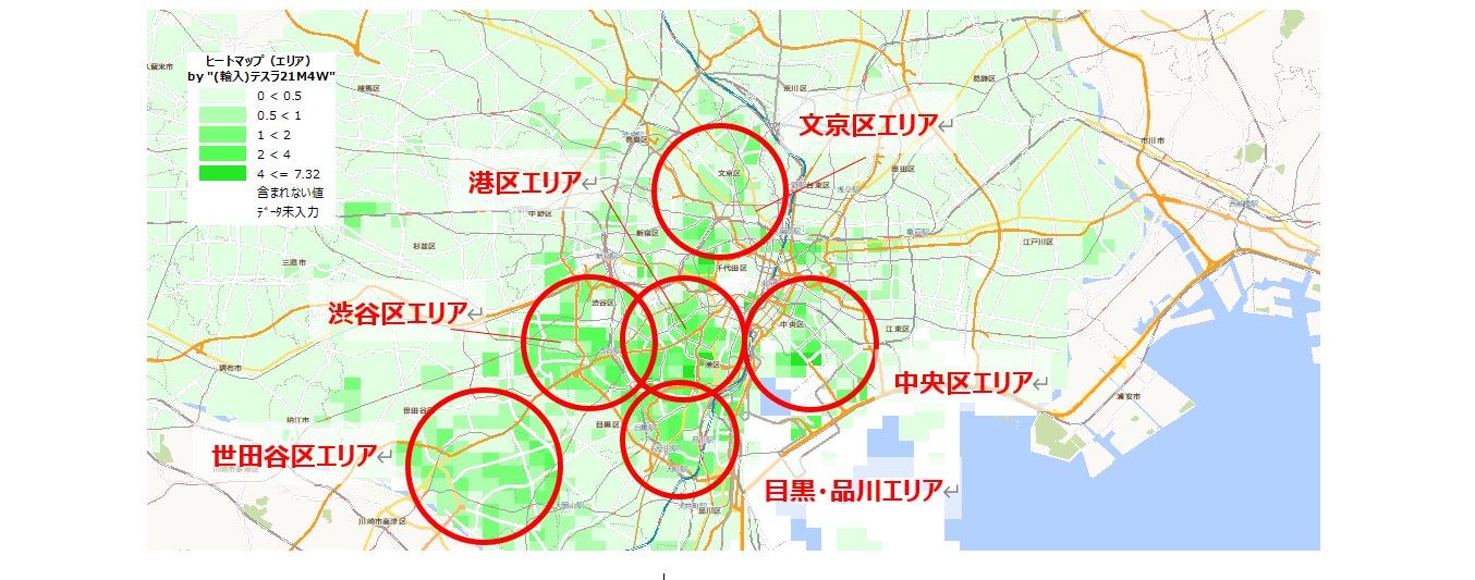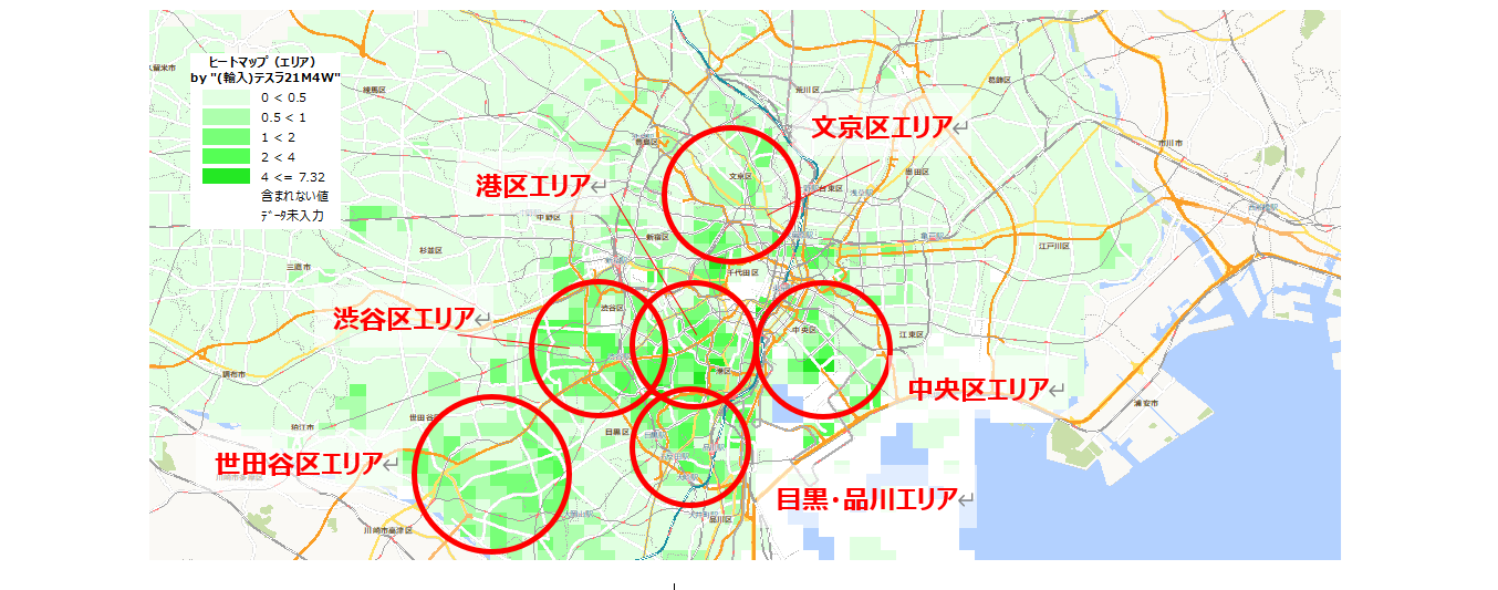 これらのデータにより、例えばフェラーリはタワーマンションが集中する都心部の富裕層が多く居住するエリアに集中していますが、テスラは自動車を充電できるスペースを確保しやすい、近郊の戸建てエリアにも波及する可能性が高い等の仮説が立てられます。