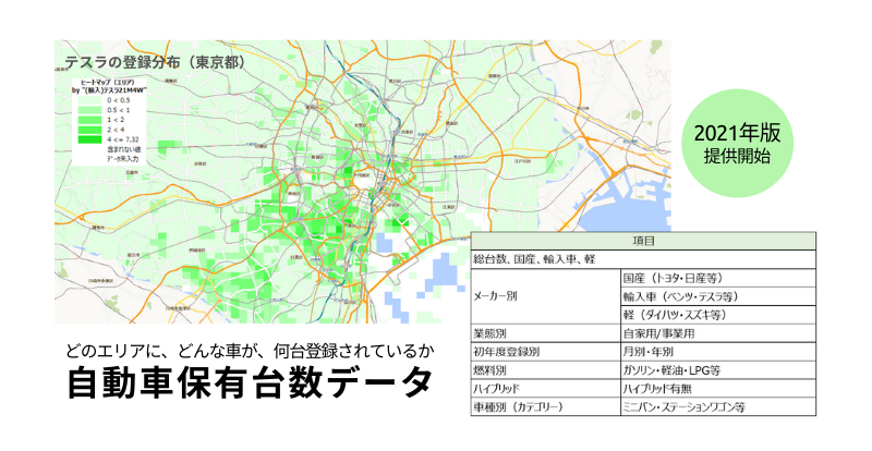 技研商事インターナショナル株式会社(名古屋本社:愛知県名古屋市、東京本社:東京都新宿区、代表取締役:小嶌智海、以下当社)は、メッシュや町丁目、郵便番号界単位でメーカー別、業態別、初年度登録別(月別・年別)、燃料別、車種別に台数を収録するGEOデータ「自動車保有台数データ(2021年版)」の提供を開始しました。
