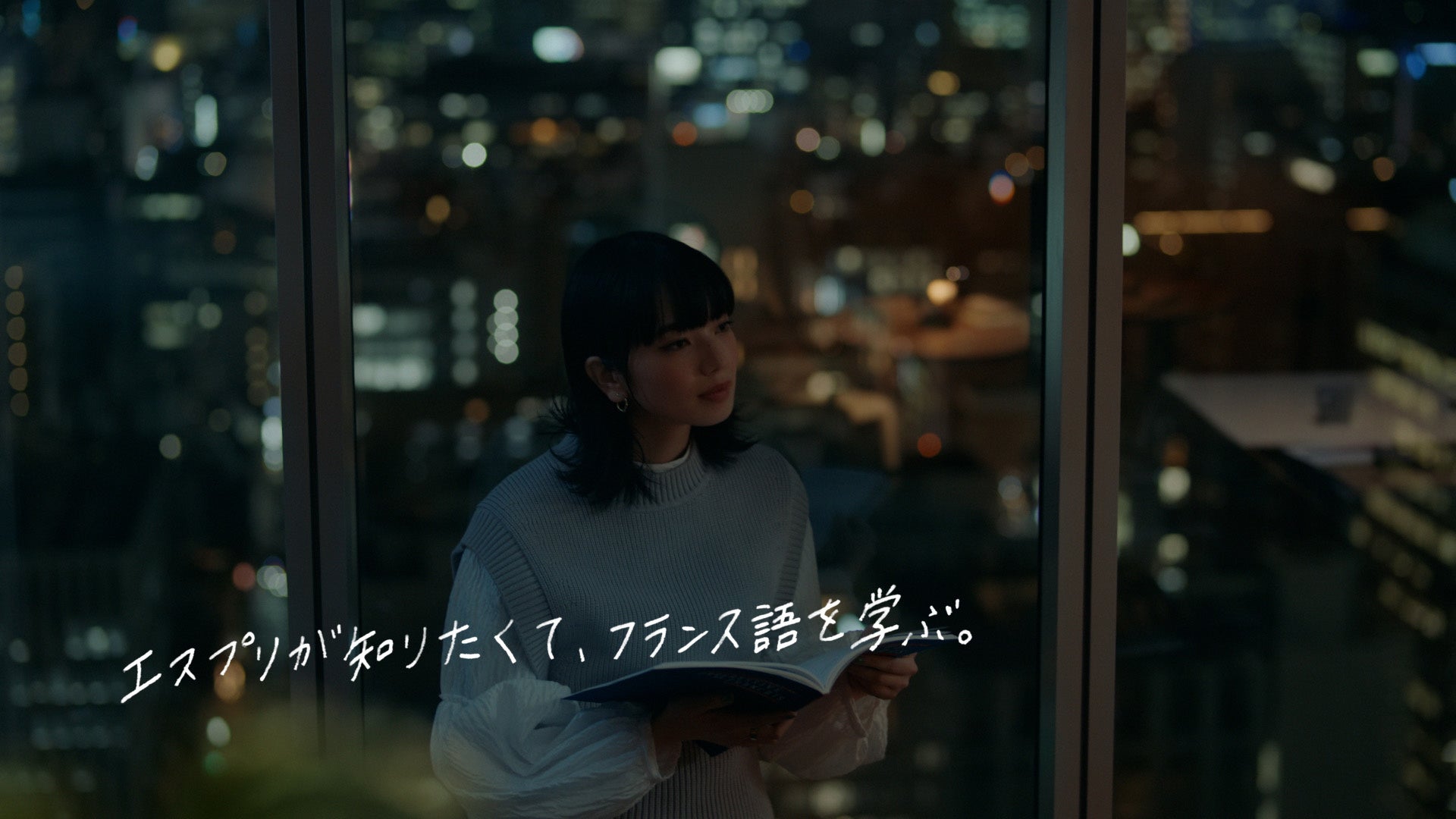 「フランス語」篇―「エスプリが知りたくて、フランス語を学ぶ。」という言葉とともに、流暢なフランス語で楽しそうに先生と会話する姿を描く。