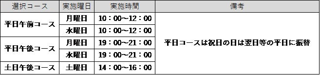 平日クラスは毎週月曜日と水曜日、土日クラスは土曜日に開講します。