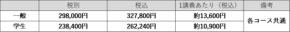 同様の他講座では、受講料が35万円以上したり、受講料以外に入会金が発生したりするものもありますが、本講座は29万8,000円(税込32万7,800円)で受講可能で入会金は0円です。また、学生の方には20%の学割金額23万8,400円(税込26万2,240円)をご用意しています。