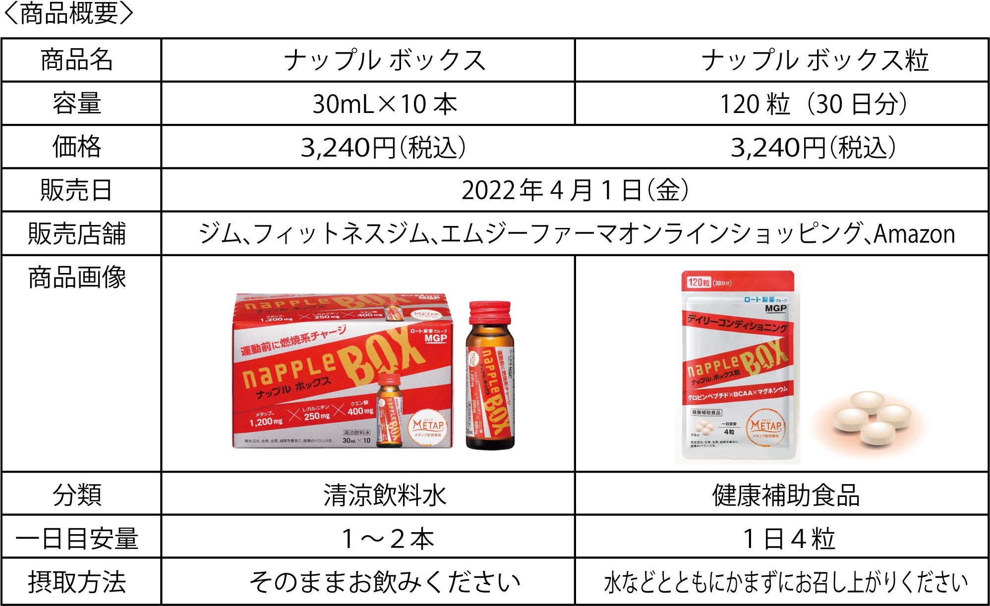 ロート製薬株式会社(本社:大阪府大阪市、代表取締役社長:杉本 雅史)の子会社であるエムジーファーマ株式会社(本社:大阪府茨木市、代表取締役:墨田 康男、以下 エムジーファーマ)は、世界チャンピオンを陰で支え、惜しまれつつも2019年に終売した燃焼系ドリンク「ナップルボックス」の再販売と、新たに開発した「ナップルボックス粒」の発売を決定いたしました。本品は2022年4月1日、ジム、フィットネスジム、エムジーファーマオンラインショッピングやAmazonにて発売いたします。