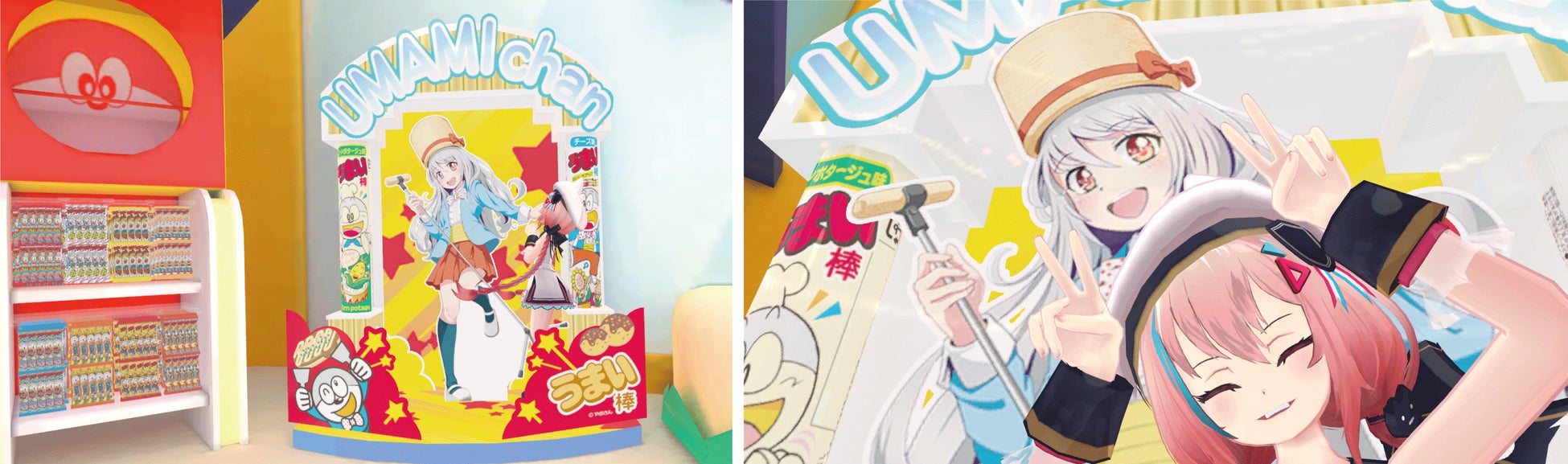 大阪通天閣ANNEXにあるうまい棒ショップをモチーフにしたバーチャル上で展開するうまい棒ショップです。ショップ内ではアバターがうまい棒の妹キャラクター “うまみちゃん”の撮影ブースで撮影ができたり、うまい棒になれる顔出しパネルで撮影ができたり、うまい棒神社の前に立つとうまみちゃんとうまえもんが今日の運勢を教えてくれたりと、様々なコンテンツでうまい棒と駄菓子の世界が楽しめます。