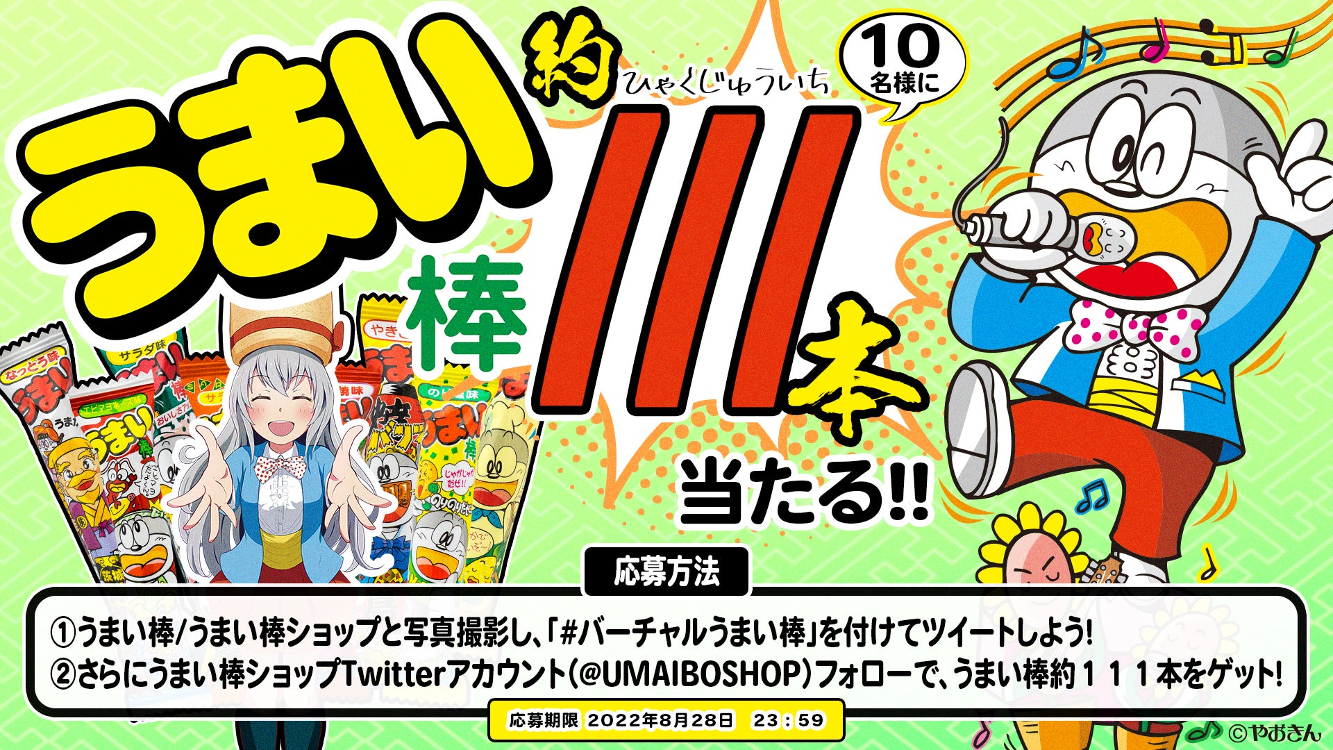 会場内にあるうまい棒ブースでは、うまい棒のコスプレを着用したバーチャルマーケット公式キャラクター「Vketちゃん」がうまい棒を配っているので、探してうまい棒をゲットしよう!ゲットしたうまい棒か、うまい棒ショップを撮影した写真を「#バーチャルうまい棒」を付けてツイート&ショップTwitterアカウント(@UMAIBOSHOP)をフォローすると、うまい棒約111本が抽選で10名様に当たります!