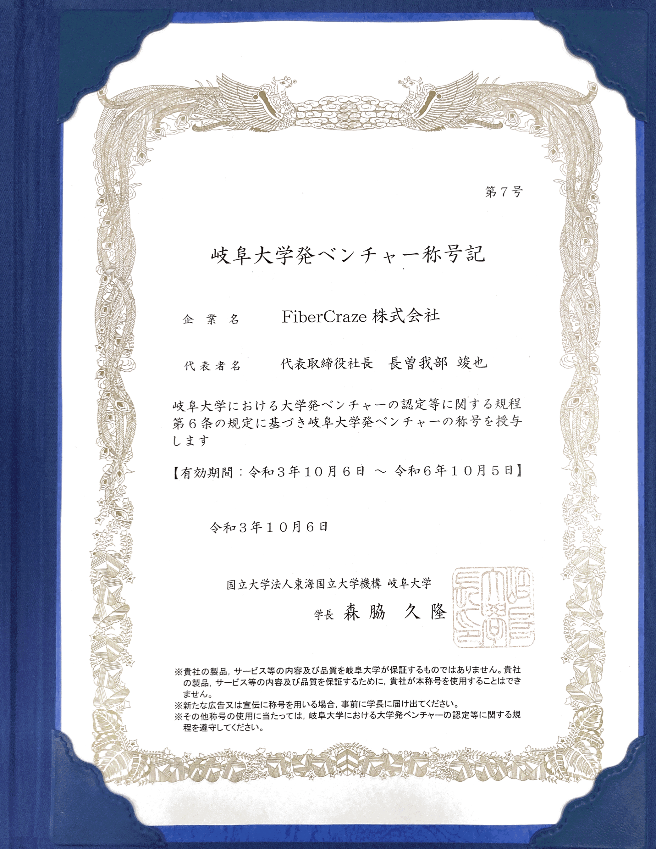 岐阜大学では、起業家育成教育の本格化や、起業相談の取り組みの推進により、ベンチャー設立数が増加し、平成31年4月より同大学と大学発ベンチャーとの関係を明確化するとともに、同大学における大学発ベンチャーの円滑かつ適正な支援を図る目的で大学発ベンチャーの認定制度を開始しており、この度、令和3年度第1回岐阜大学発ベンチャー審査委員会における選考を経て、ファイバークレーズ株式会社は岐阜大学発ベンチャーの称号を授与されることが決定致しました。