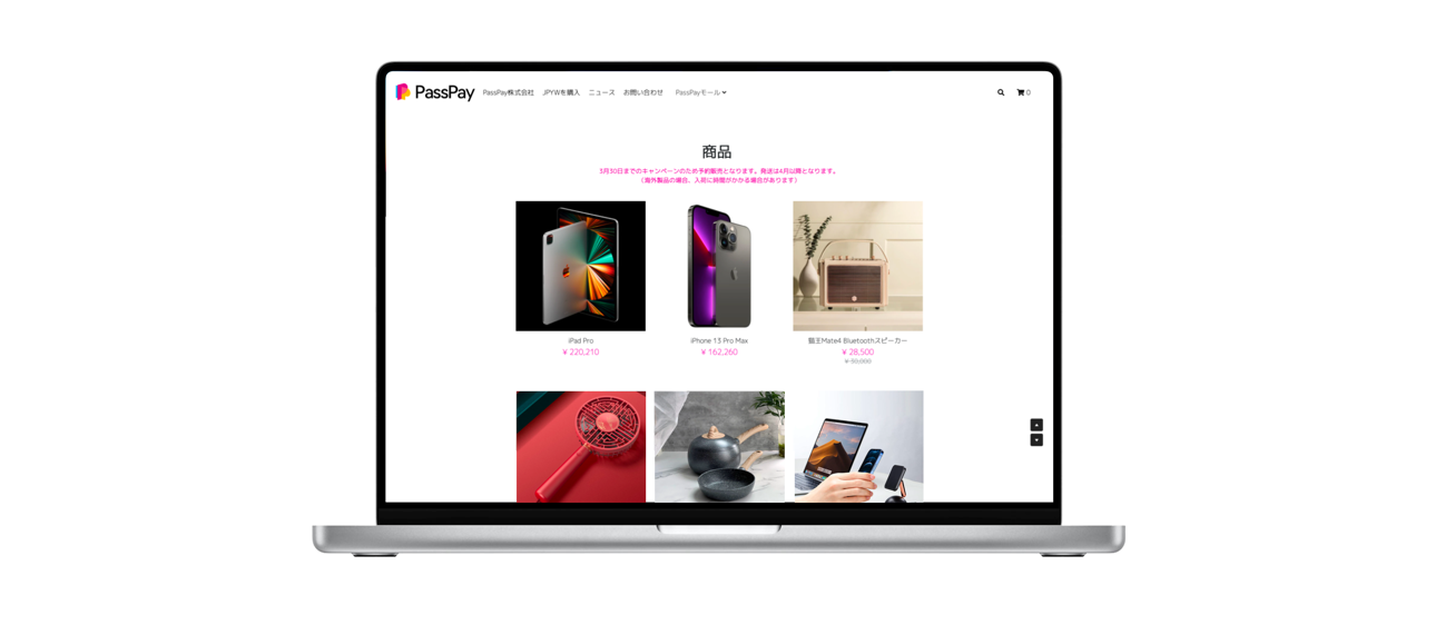 PassPayモールは、JPYWを支払い手段としたECサイトです。価格が安定した日本円ステーブルコインのJPYWによって、暗号資産の価格変動リスクを回避しながらショッピングを楽しんでいただけます。また、ブロックチェーンベースのトークンというJPYWの特性を活かすことで、日本国内のみならず、海外のユーザーもより気軽に利用が可能なため、PassPayモールはまさに「国境を越えるEC」としての特質も備えています。