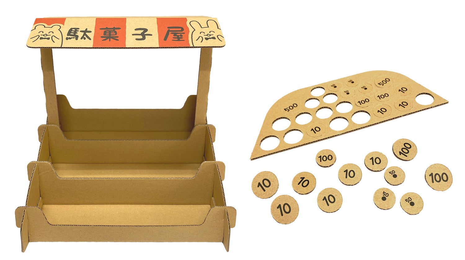『おうちで駄菓子屋さん』はかわいいイラストが描かれたギフトボックスの中にお菓子セットと組立式屋台型陳列台が入っています。