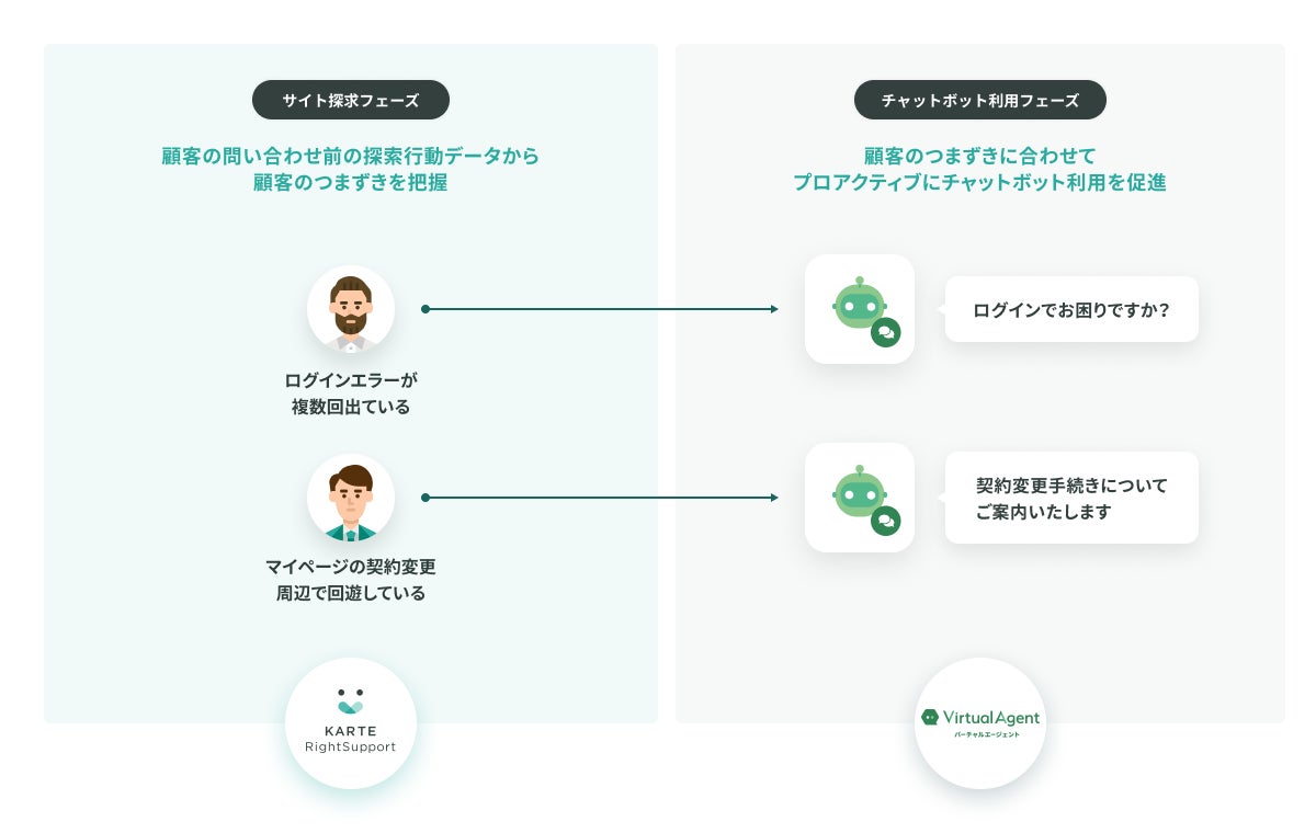 エンドユーザーのつまずきに合わせたチャットボットへの送客や声がけをすることで良質なCX(顧客体験)を作り、チャットボットの低い利用率や正答率に悩む顧客にはKARTE RightSupportで取得した情報を連携することによる改善支援を実施していきます。