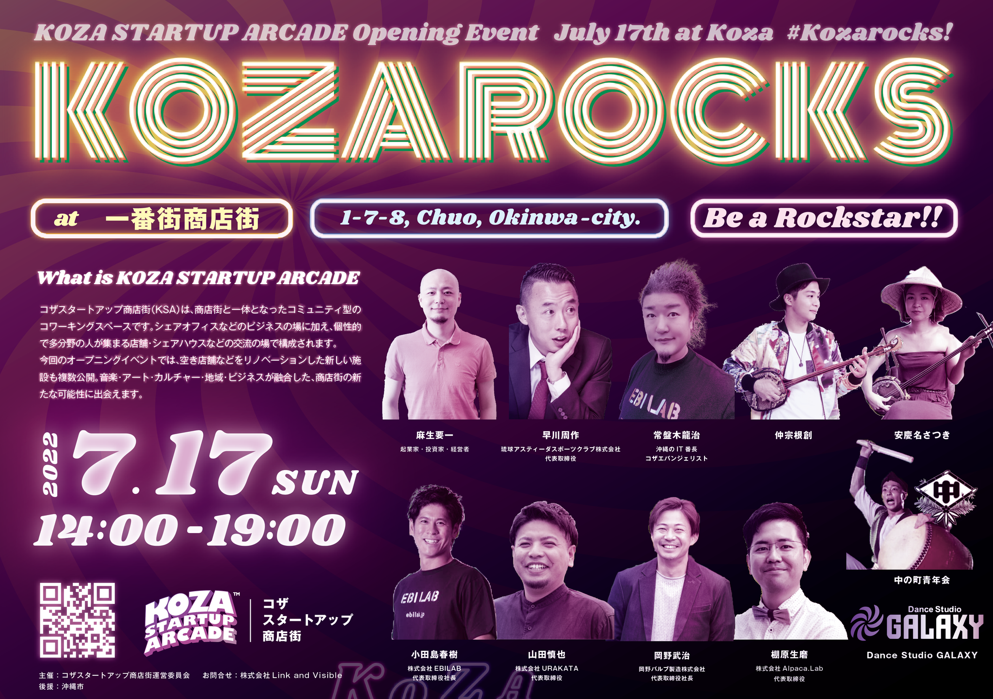 コザスタートアップ商店街運営事務局(代表:豊里健一郎)は、沖縄県沖縄市中央(通称:コザ)の商店街を「コザスタートアップ商店街」としてリブランディングオープンしたことを記念し、7月17日(日)に商店街一体を巻き込んだオープニングイベント『Kozarocks!』 開催します。