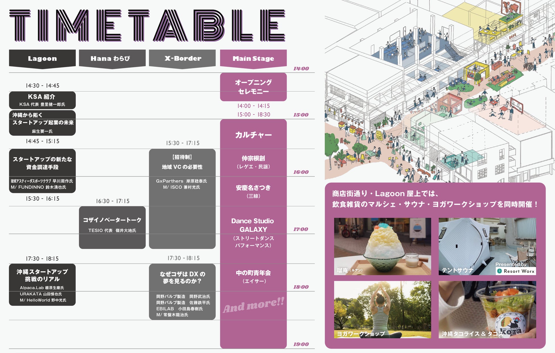 商店街の空き店舗などをリノベーションした新しい施設をお披露目するオープニングセレモニーを開催。起業家・経営者・投資家の麻生要一氏、琉球アスティーダ社長の早川周作氏をはじめとする豪華ゲストによるトークセッション、地元アーティストの音楽ライブ・中の町青年会によるエイサー演舞などの沖縄カルチャー、地域と連携したマルシェ・ダンスパフォーマンスなど、充実したコンテンツをご用意しています。