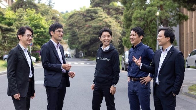 左から、東北大学材料科学高等研究所 所長 折茂 慎一 教授、当社 CTO兼 同研究所 西原研究室 西原 洋知 教授、リアルテックファンド グロース・マネージャー 山家 創 氏、当社 代表取締役CEO 黒田 拓馬、当社顧問 株式会社リバネス 代表取締役グループCEO 丸 幸弘 氏
