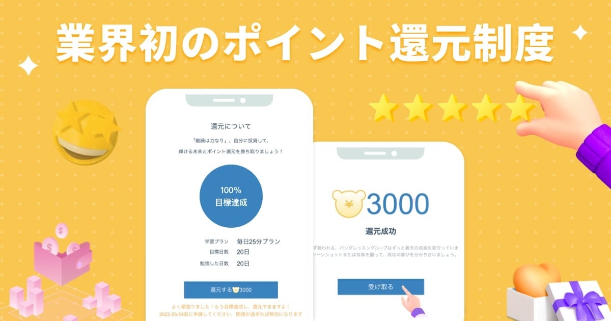 VIP会員は毎月学習目標達成でポイント還元制度が備えています。VIPプランを購入したVIP会員が目標の出席回数を達成すると、パンダコインが還元されます。