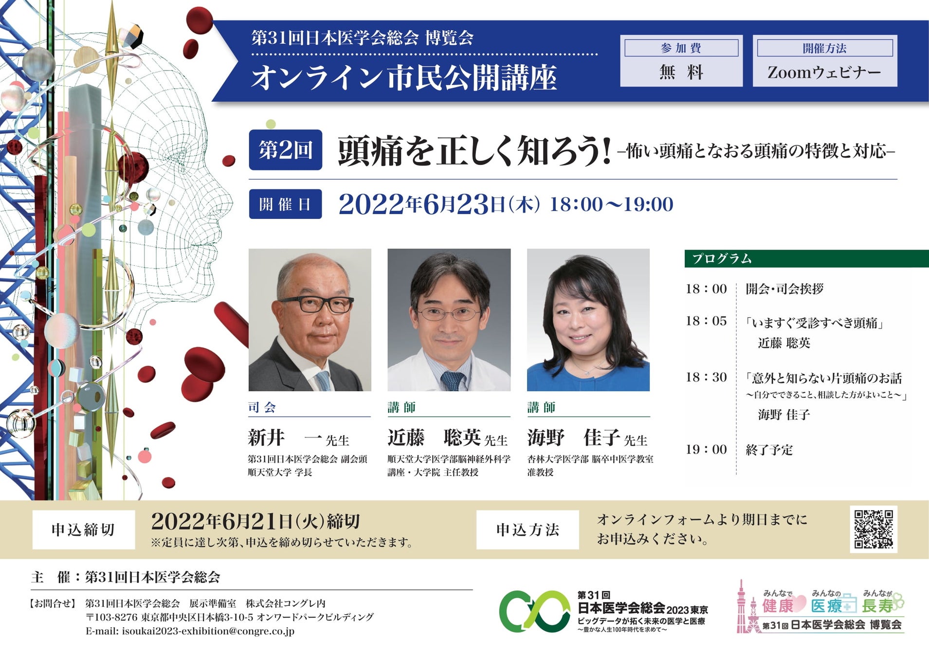 第2回オンライン市民公開講座は、司会に第31回日本医学会総会 副会頭・順天堂大学 学長の新井 一 先生、講師に近藤 聡英 先生(順天堂大学医学部脳神経外科学講座・大学院 主任教授)、海野 佳子 先生(杏林大学医学部 脳卒中医学教室 准教授)をお迎えし、怖い頭痛となおる頭痛の特徴と対応について、講義を行います。