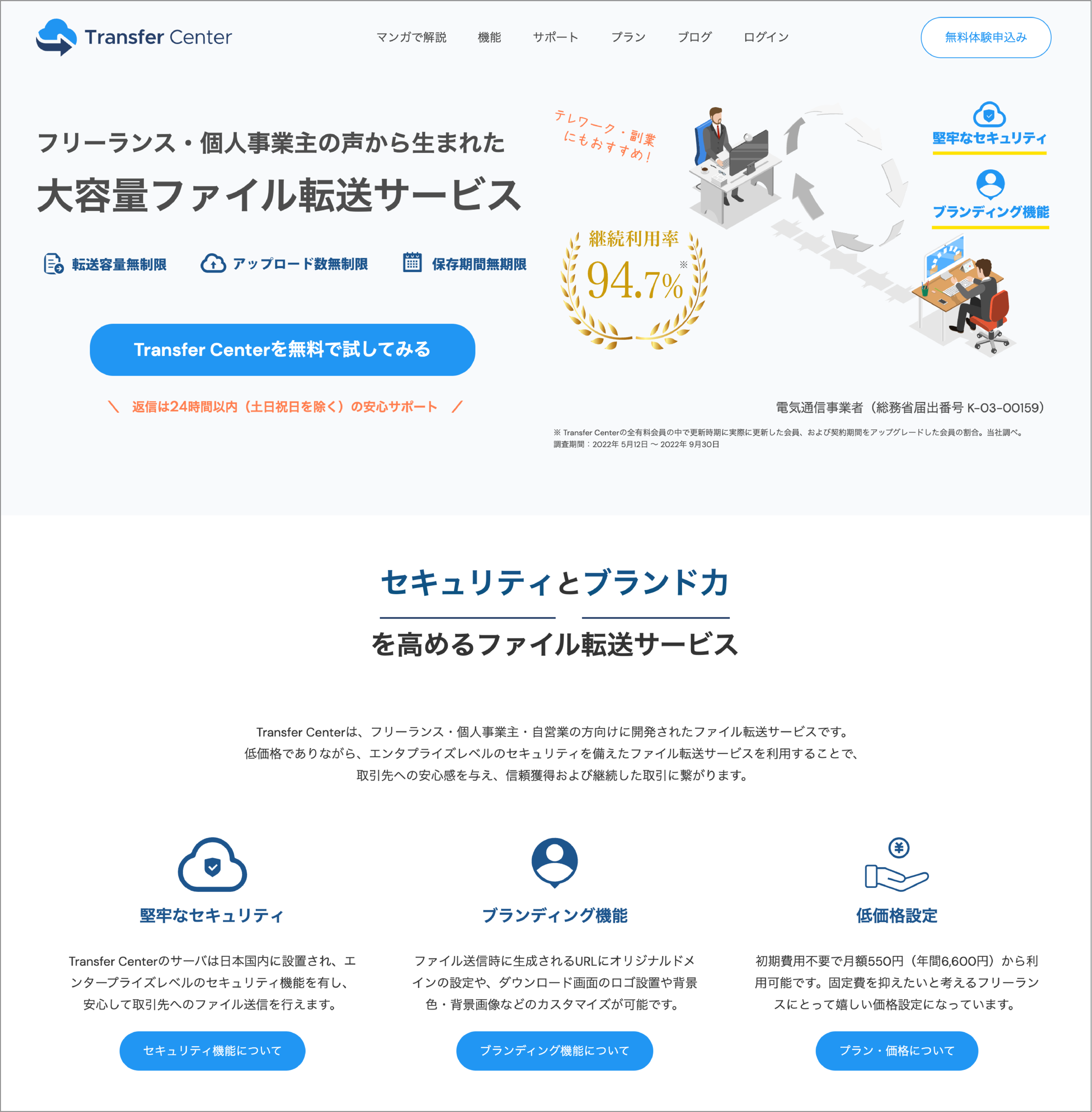 (参考リリース:月額550円で取引先の信頼を勝ち取る、フリーランス向けファイル転送サービス「Transfer Center」がローンチ!)