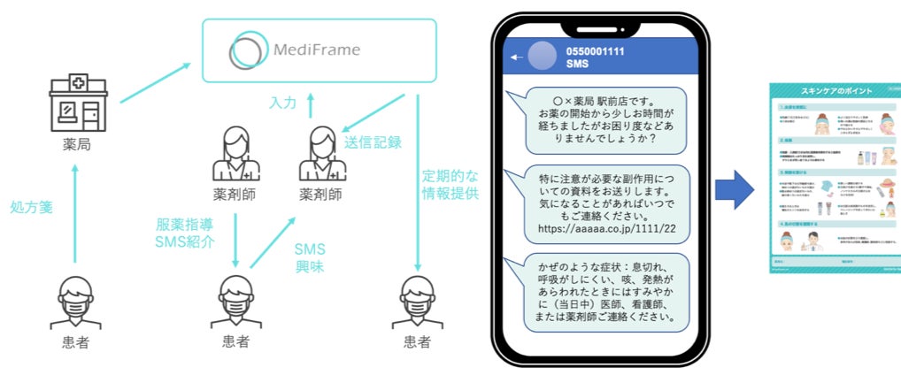 株式会社MediFrame(本社:大阪府大阪市、代表:和田 敦)は、2022年9月5日、SMS(ショートメッセージ)機能を利用して薬局が登録患者に対して、プッシュ型で効率的に情報提供を行うことができる「MediFrame SMS」サービスをリリースいたしました。