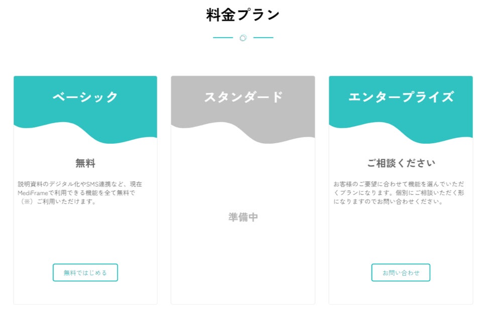今回、リリースを記念してベーシックプランを無料でご用意しました。スタンダードプラン(現在準備中)をリリースするまでの間、現在MediFrameで利用できる全ての機能を無料でご利用いただけます。