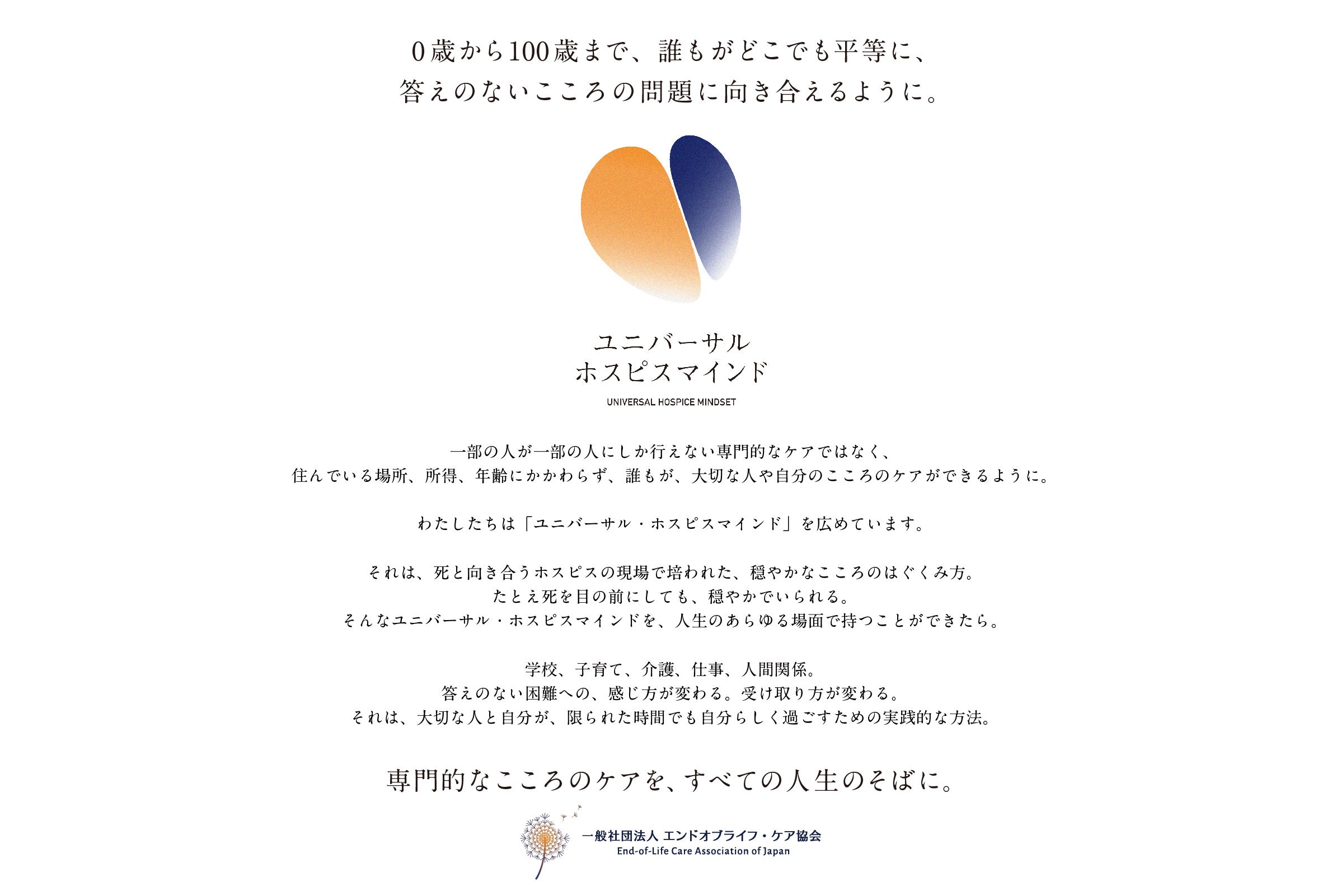 エンドオブライフ・ケア協会設立7周年となる2022年4月、その考え方を「ユニバーサル・ホスピスマインド」と名付け、ロゴとステートメントを公開。0歳から101歳がステートメントを読み上げる声をつなぎ合わせ、「ユニバーサル・ホスピスマインド」は地域、所得、年齢にかかわらず誰もが必要なこころのケアであることを伝えています。詳細は4月28日(木)公開の特設サイトにて掲載しています。
