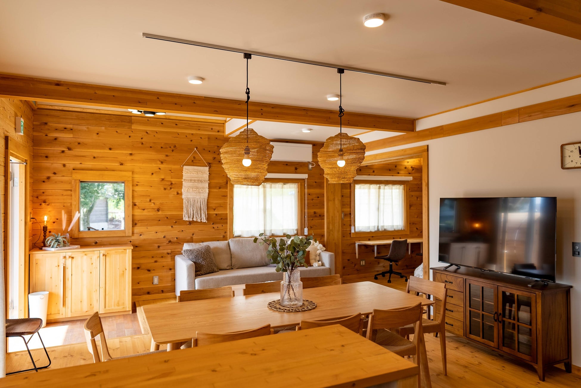 見た目もユニークで、ちょっと珍しいサウナでととのってみたい方におすすめ。サウナカーにはお庭から直接入ることができます。「貸切別荘をもっと身近に」という想いを込めつくられた波棟。1階には9人が座れるダイニングテーブルとリビングスペース、2階には小あがり畳の広々リビングがあり、ご友人と夜中まで語りあったり、ご家族でゆるやかな時間を過ごしたり、趣味や仕事に打ち込んだり、思い思いの過ごし方をお楽しみいただけます。namiでは最大9名様が宿泊可能となっております。