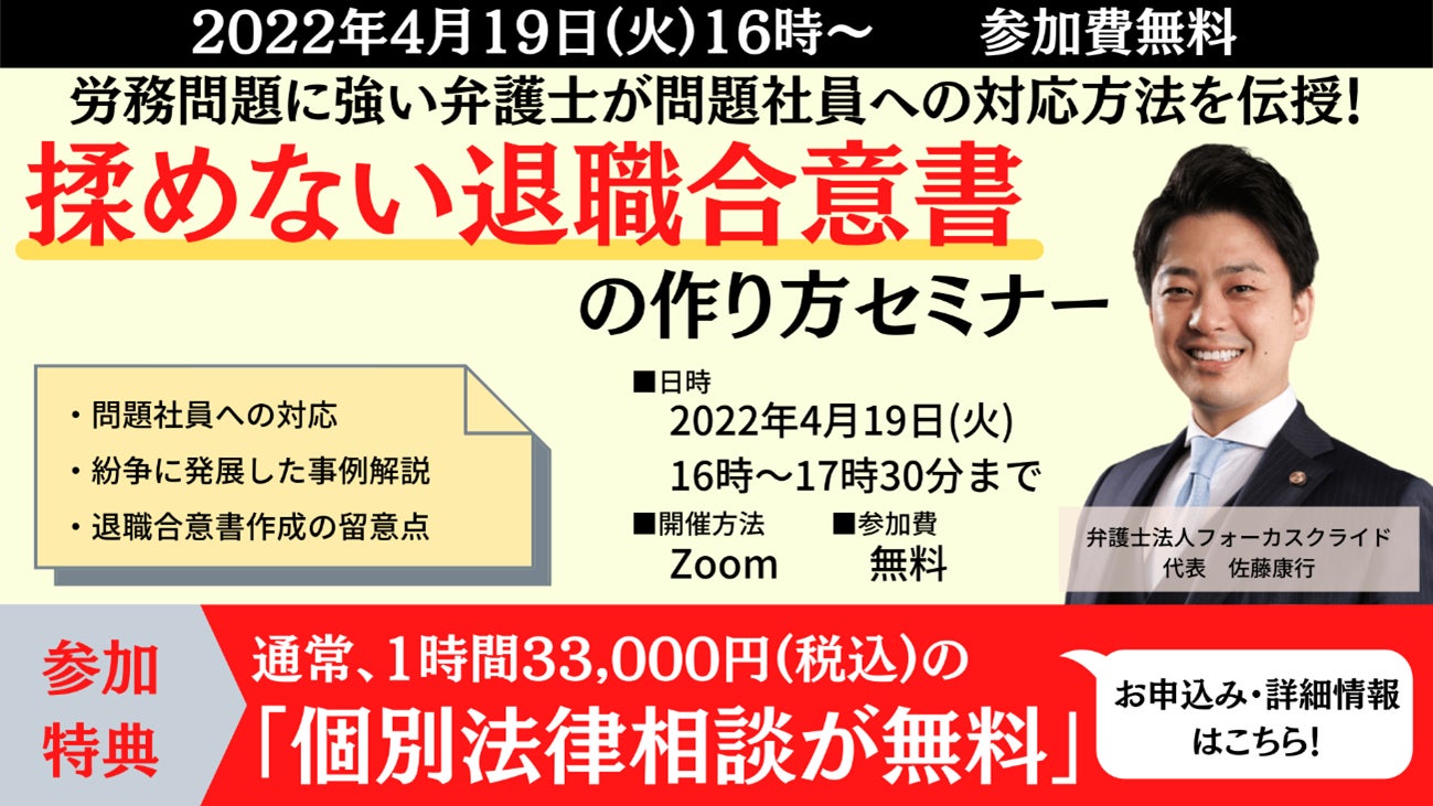 使用者側の企業法務に精通した、弁護士法人フォーカスクライド(大阪府大阪市、代表 佐藤康行)は4月19日(火)に『問題社員への対応方法を伝授!揉めない退職合意書の作り方セミナー』を開催いたしますのでお知らせいたします。