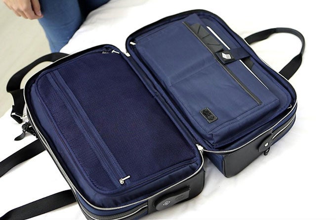 バッグの中央がスーツケースのように左右に180度開き、取り出しやく誰でも収納上手になれるバッグ。