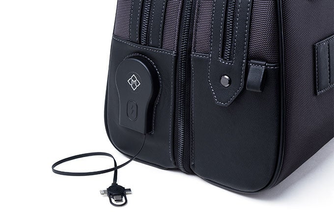 3つのプラグに対応した自動巻取りコードも付属していて、バッグの中のバッテリーからコードを外に引き出すことできるので、スマホなどのIT機器に充電しながら使うこともできますね。