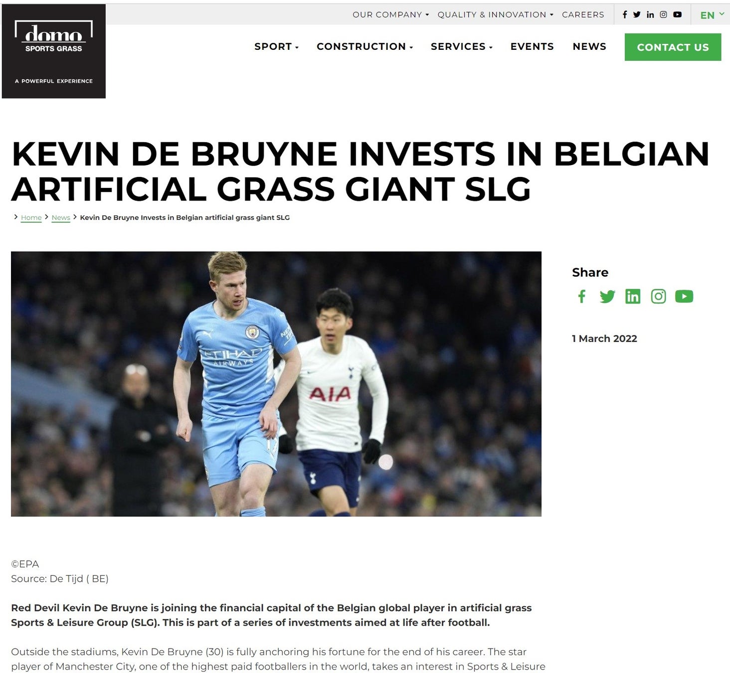 (引用:https://domosportsgrass.com/en/news/kevin-de-bruyne-invests-belgian-artificial-grass-giant-slg)