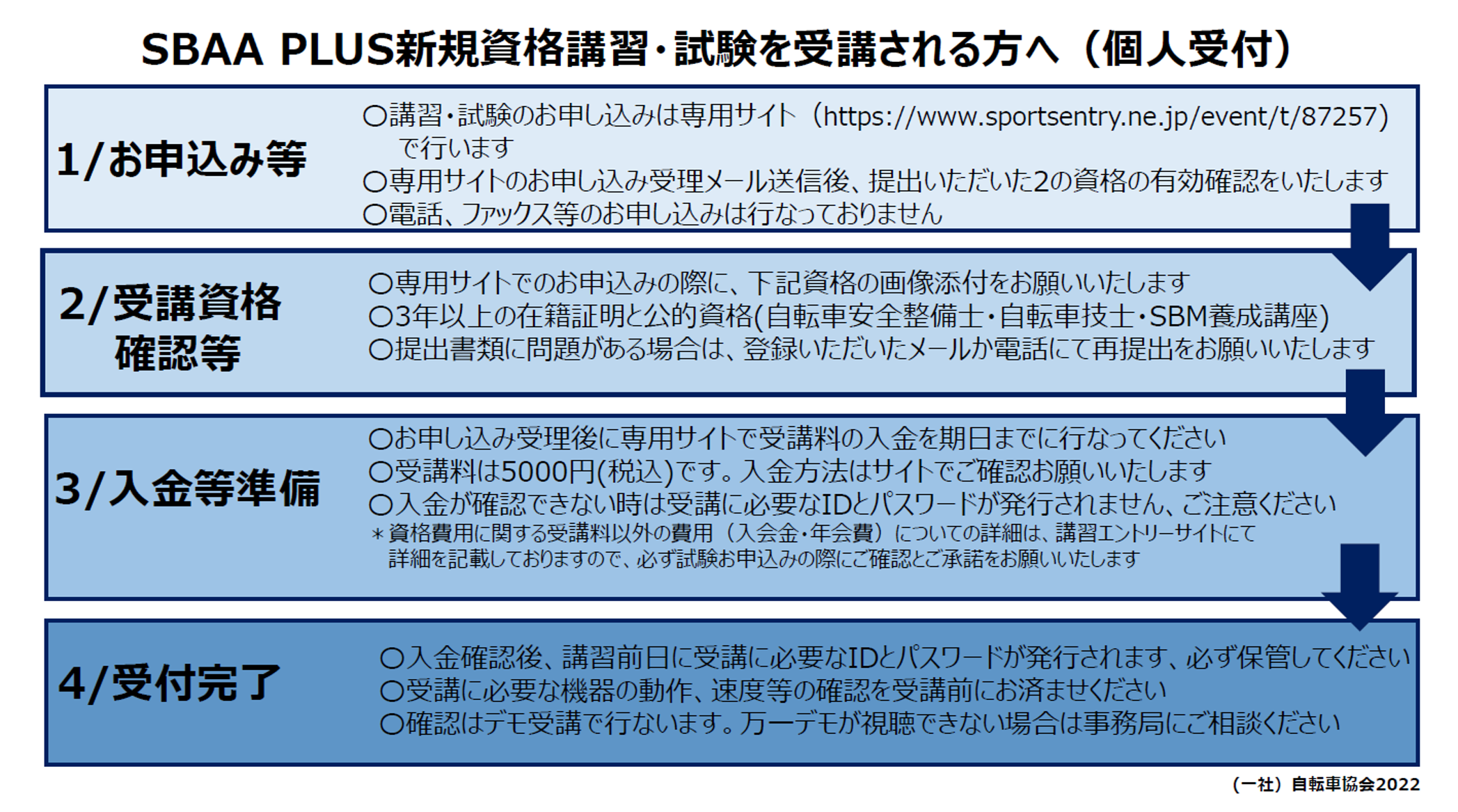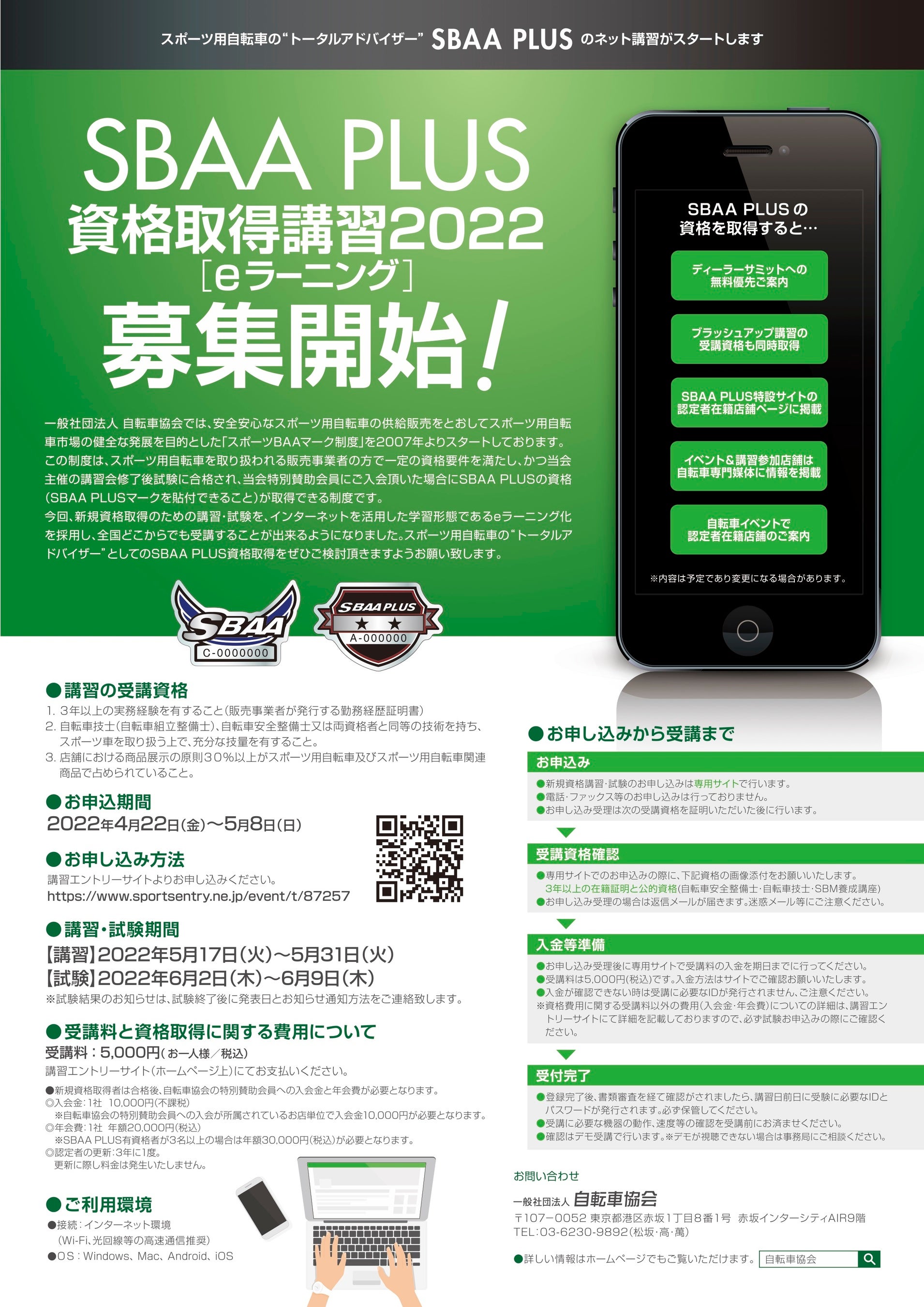 一般社団法人自転車協会(理事長:山﨑一 所在地:東京都港区赤坂1-8-1赤坂インターシティAIR 9F 以下「自転車協会」という)は、第9回となるSBAA PLUS新規資格取得講習2022のエントリーを2022年4月22日(金)~2022年5月8日(日)まで、受講は2022年5月17日(火)~5月31日(火)、試験は2022年6月2日(水)~2022年6月9日(木)に開催いたします。
