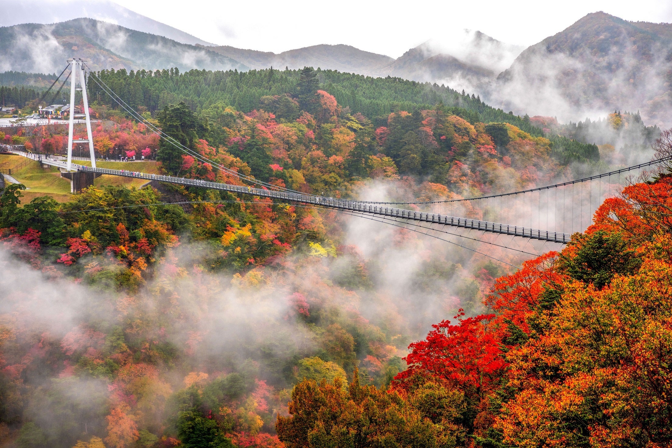 そんな九重町の看板ともいえる観光スポットが九重“夢”大吊橋です。2006年10月30日にオープンし、来場者数は延べ1,200万人以上となりました(2022年6月現在)。長さ390m、高さ173mで歩行専用橋としては日本一の高さを誇る吊橋です。吊橋からは日本の滝百選に選ばれた名瀑「震動の滝」やくじゅう連山を望むことができ、季節ごとに姿を変える鳴子川渓谷の景色を楽しむことができます。