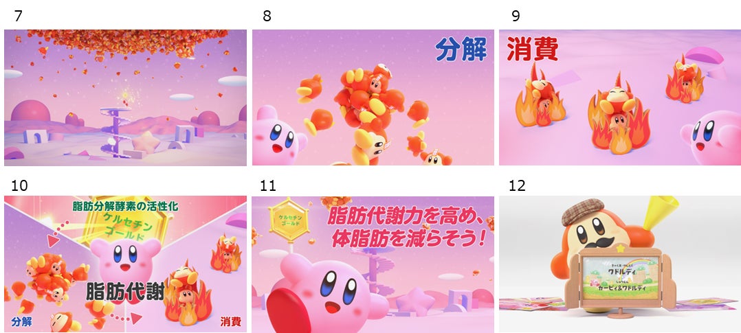 動画は、カービィがワドルディをすいこむ歴代のシーンからスタート。カービィにすいこまれたワドルディと「特茶」を追いかけていくと、物語はカービィのおなかの中へ!なんとそこでは、ワドルディ扮する体脂肪がくっついて集まって、驚くほど超巨大な塊になっていたのでした。このままでは体脂肪は溜まったままなのですが…一緒にすいこんでいた「特茶」に含まれるケルセチンゴールド※1が驚きのパワーを発揮!脂肪分解酵素を活性化することで、体脂肪の塊が分解、消費され、減っていくのでした。