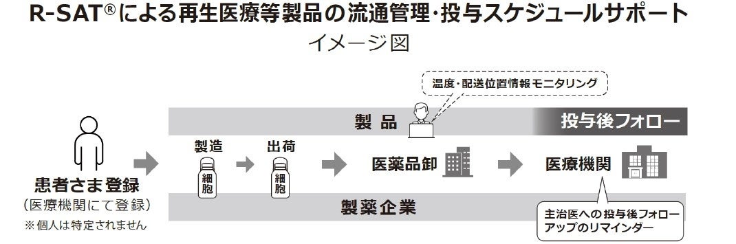 「R-SAT(R)」は、Regenerative medicine(再生医療薬)、Safety(安全性)、Accuracy(正確)、Traceability(トレーサビリティ)の頭文字を取ったものであり、再生医療等製品を投与される患者さまの登録から、再生医療等製品の輸配送、投与および投与後のフォローまでの情報を一元管理し、製薬企業、製造業者、輸配送業者、医療機関などの関係者がそれらの情報を共有できる流通管理・投与スケジュールサポートシステムです。