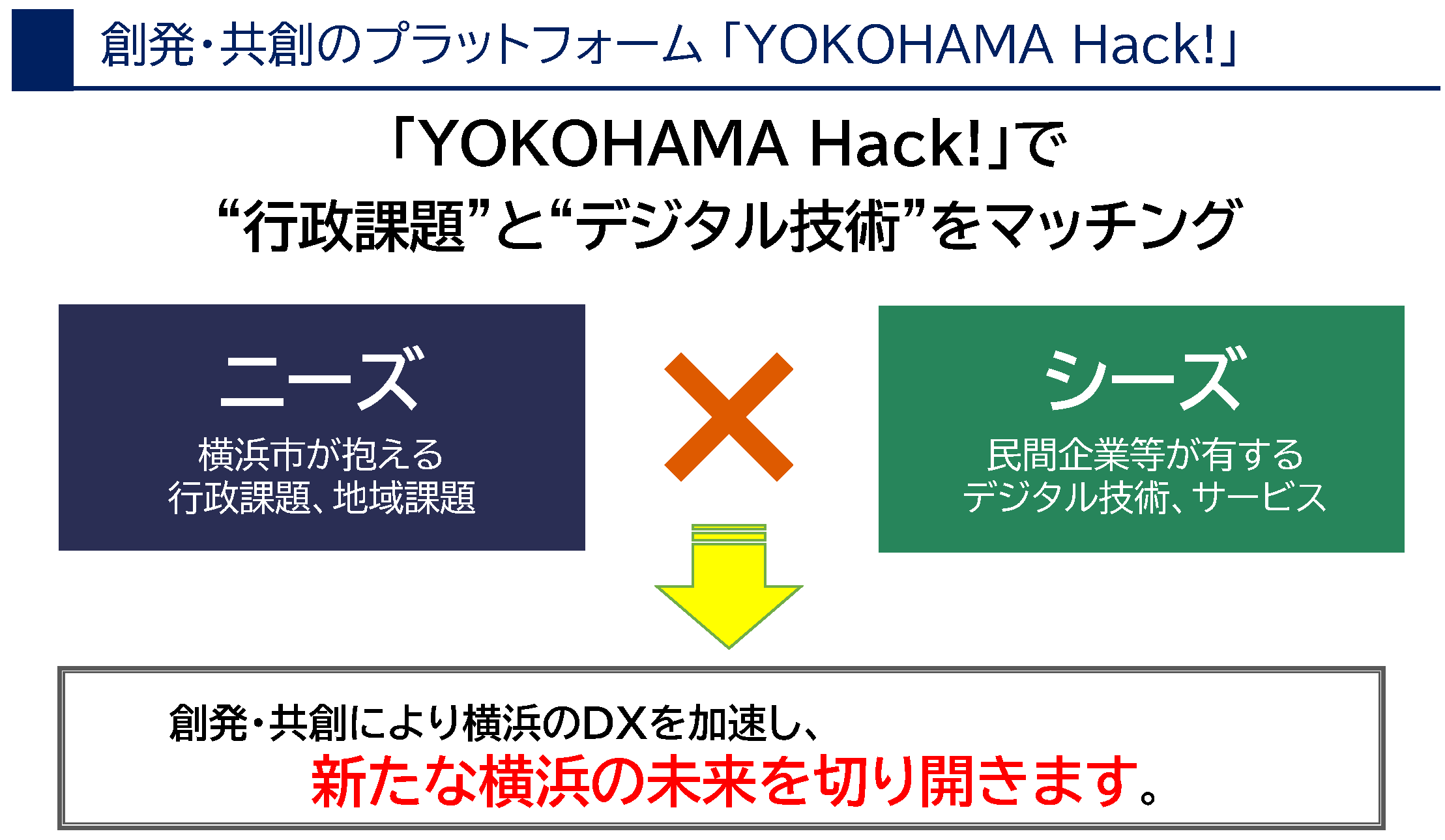 横浜市では、「横浜DX戦略(素案)」(令和4年6月3日公表)の重点方針6として掲げている「創発・共創とオープンイノベーションの仕組みづくり」として「YOKOHAMA Hack!(ヨコハマハック)」を立ち上げます。