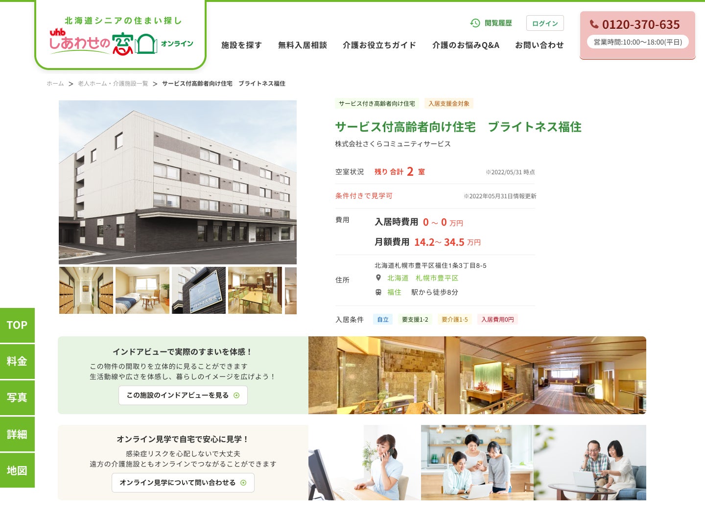 Webサイトのメイン機能は道内最大規模の高齢者向け施設検索と見学・面談マッチング。検索データベースに掲載を希望する道内の高齢者向け施設を対象に、外観や内覧の写真、空室情報、紹介文章、提供サービス・価格等を入力してもらいます。実際に見学できないご本人やご家族のために室内の様子を全方位パノラマ写真で閲覧できる「360°パノラマビュー」機能やWeb会議システムを利用したオンライン見学サービスも提供します。