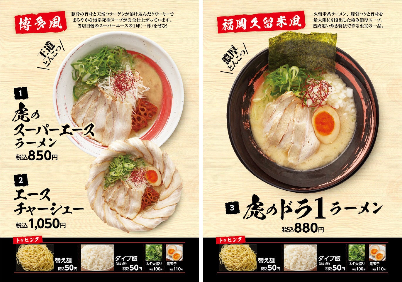正統派の泡系豚骨ラーメンながら、加虎風のアレンジを効かせ、揚げレンコンが新しいアクセントになるオリジナルさや、なんといっても一押しが、器全体を花びらのようにチャーシューが囲むインパクト大の「エースチャーシュー」!