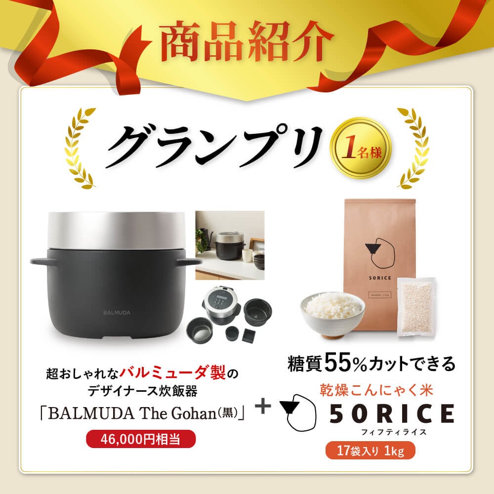 受賞した方には超おしゃれなバルミューダ製の炊飯器と、こんにゃく米「50RCE」1kgをプレゼントいたします。