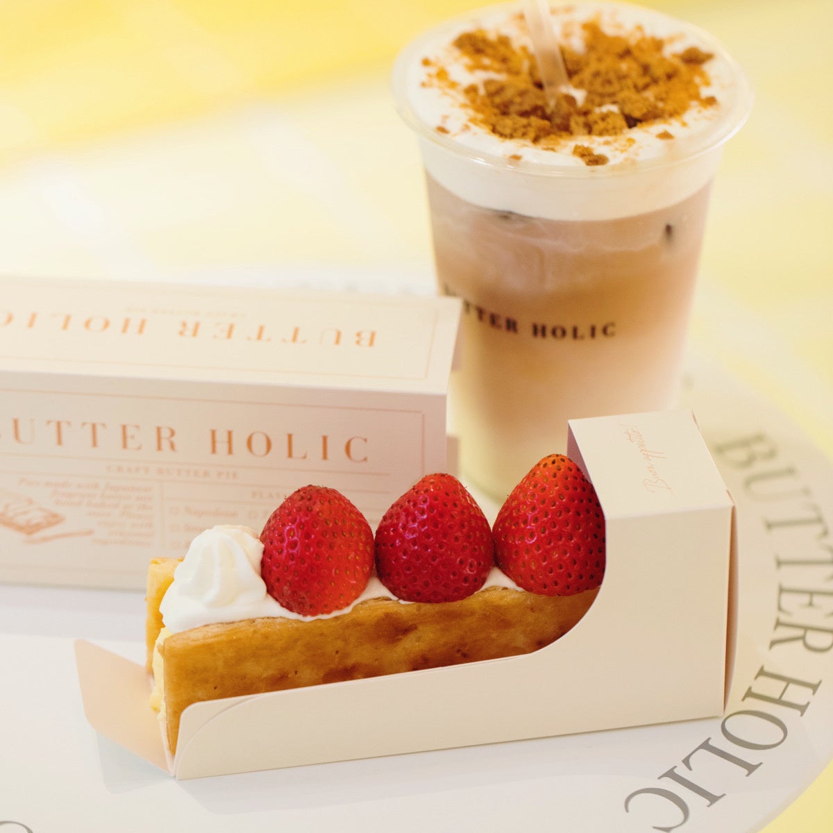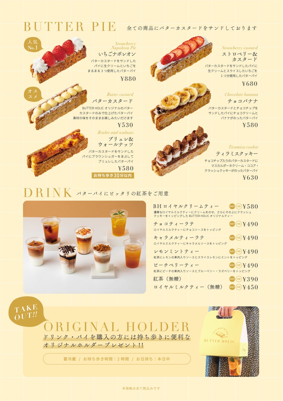 「クラフトバター専門店」ならではのパイの食感とバターの風味を感じていただくため、 パイ厚みやキャラメリゼの強さを調節し、ほんのりと塩味をプラスしました。 また、パイだけではなく、クリームにもバターを感じていただくため、しつこくない濃厚バターカスタードを開発しました。 今までにない「片手で食べられるワンハンドミルフィーユ」をお届けするため、 みなさんに喜んでいただけるだけのボリューム感を損なわないよう配慮しながらも クリームがこぼれやすい等の課題を解決して参りました。 ただおいしい・かわいいだけじゃない、 忘れることのできない「記憶に残る」BUTTER HOLICバターパイを ぜひお召し上がりください。