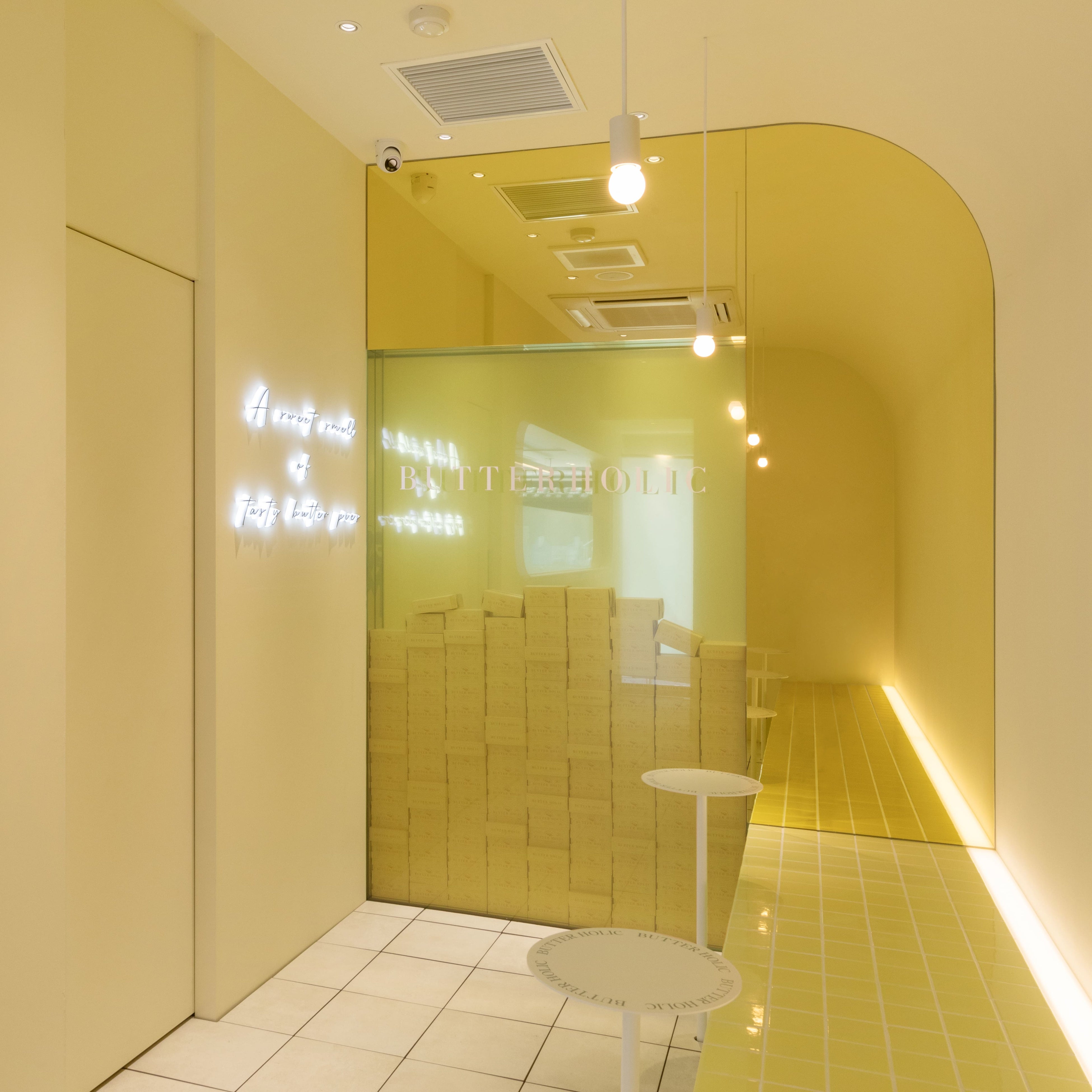 ・「BUTTER HOLIC」のロゴがプリントされた、バター色のタイルベンチ