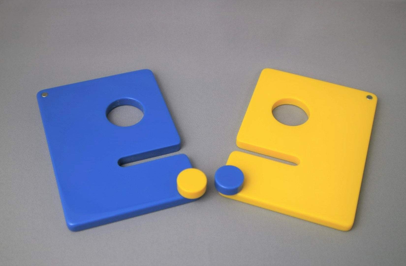 鯖江の眼鏡フレームメーカーである弊社は、眼鏡フレームと同じ生地でウクライナ支援の為に何かできないか考えました。過去にスマホスタンドを作った経験があることから、ウクライナ色の生地を揃え作ってみることにしました。実際に試作してみると、とても色合いがよく、良い出来あがりとなりました。また組み立てる前の状態を並べてみると、2人の顔が寄り添っているようで、平和を象徴しているようでした。 そのような経緯で、この商品を通して少しでもウクライナを支援したいと思い今回の寄付金付きスマホスタンドの販売を開始することとしました。