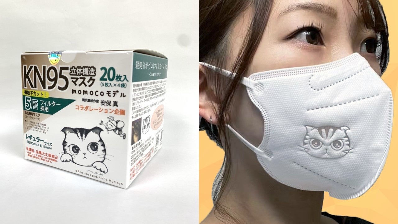 全国マスク工業会会員企業のアイ・ビー・アールが取り扱う5層フィルター構造のKN95規格のマスクに、現代墨絵作家、安保真先生が描いた猫(momoco)を刻印したコラボレーションマスクです。バクテリア飛沫(BFE試験)・ウイルス飛沫(VFE試験)99%を捕集(一般財団法人カケンテストセンターにてフィルター部捕集(ろ過)効率試験結果より)する性能に加え、立体構造、フィット感の追求(アジャスター付き)、肌摩擦が起こりにくい、眼鏡が曇りにくい、耳が痛くなりにくい等の実用性も追求したマスクです。