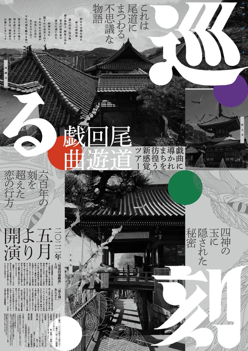 尾道三山(大宝山、愛宕山、瑠璃山)の寺院群は、巨石信仰の聖地である向島の「岩屋山」の方角を向いて建てられています。岩屋山を「南」とすると、「西」に大宝山、「北」に愛宕山、「東」に瑠璃山が位置することから「尾道は四神相応の地である」と考えられてきました。 尾道回遊戯曲「巡る刻」では、この四神伝説になぞらえた戯曲を鑑賞しながら、尾道の東西南北に点在するパワースポットを巡ります。